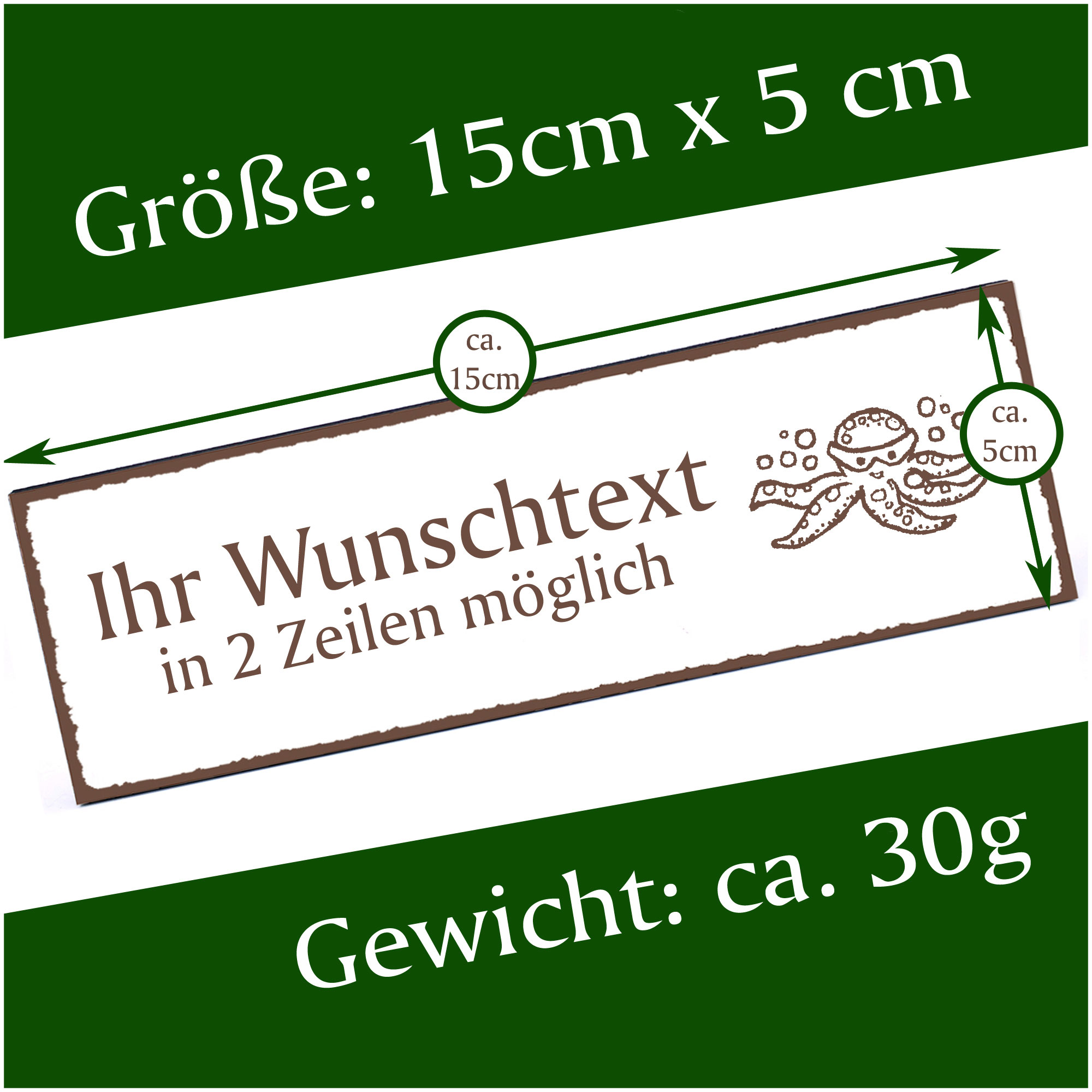 - HOLZSCHILD: Das Türschild ist ca. 150mm x 50mm groß. Das HDF Holz hat eine Stärke von 5mm. Insgesamt wiegt das Schild ca. 30g. Bitte vor Feuchtigkeit schützen