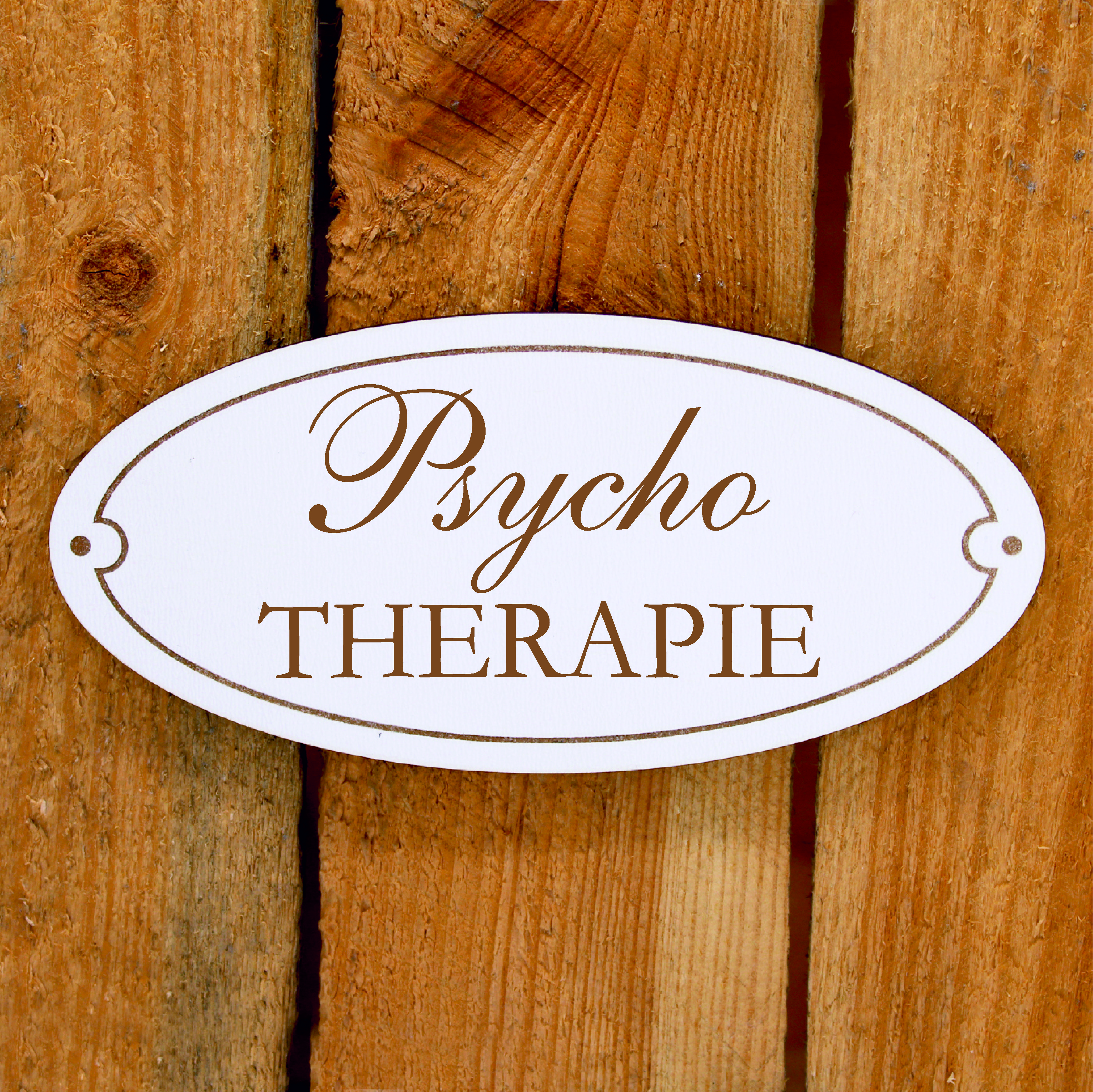 Das PSYCHO THERAPIE Dekosschild besteht aus stabilem, robustem Holzwerkstoff HDF (hochdichte Holzfaserplatte) mit weißer Beschichtung und einer braunen Lasergravur.