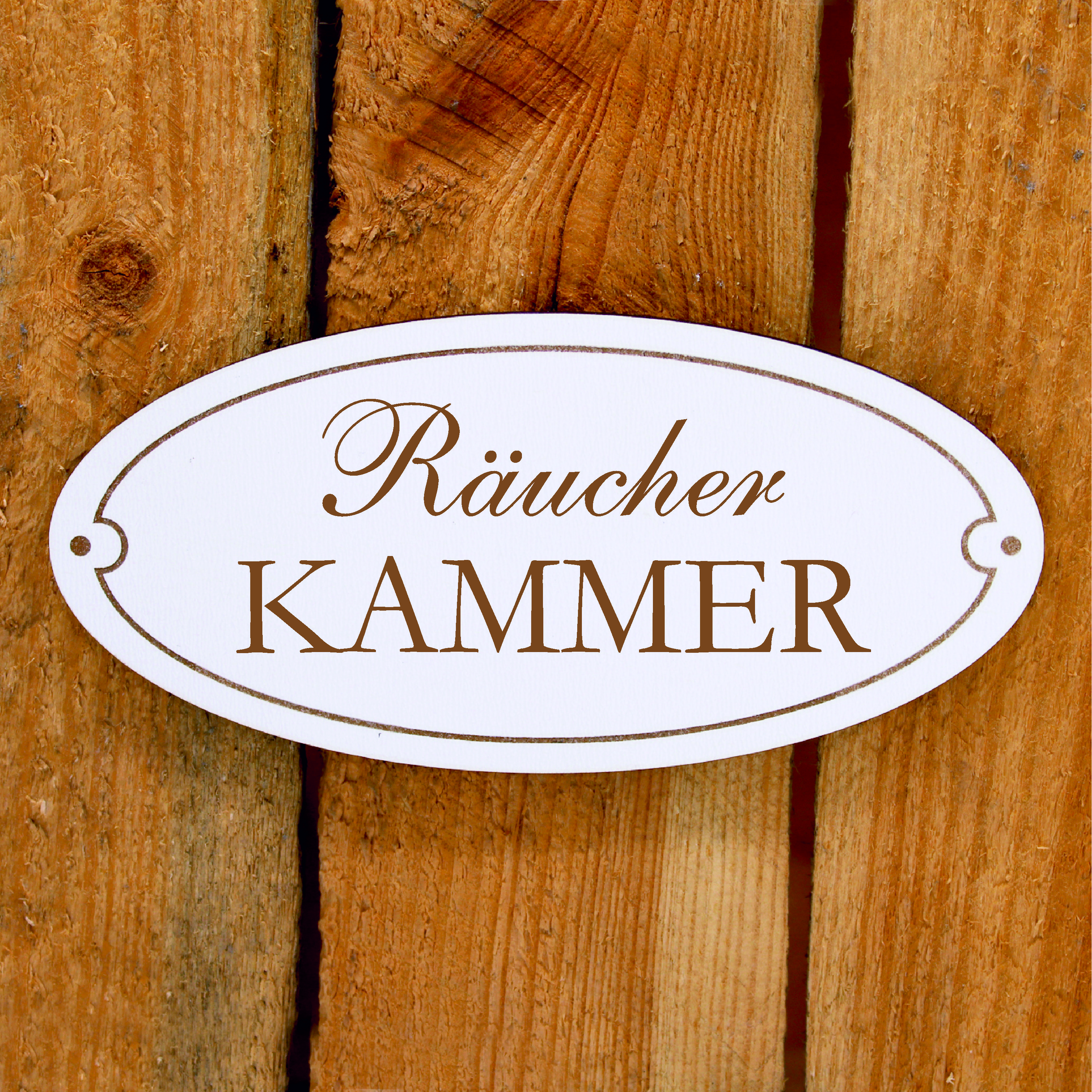 Türschild RÄUCHER KAMMER Schild oval Räucherkammer weiß selbstklebend graviert Holz Türdeko 15x7cm