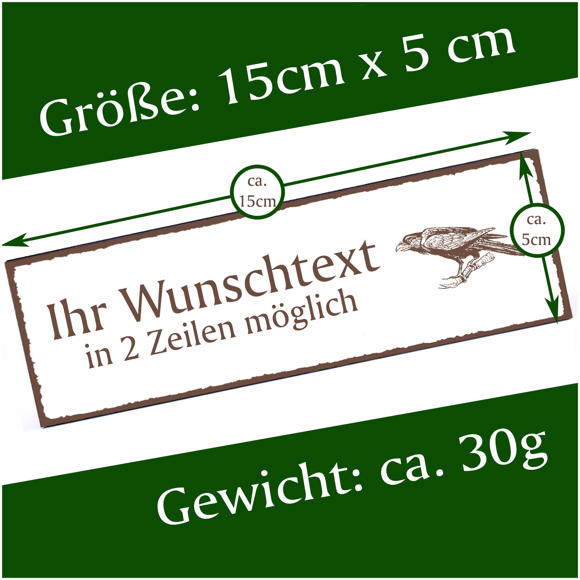 - HOLZSCHILD: Das Türschild ist ca. 150mm x 50mm groß. Das HDF Holz hat eine Stärke von 5mm. Insgesamt wiegt das Schild ca. 30g. Bitte vor Feuchtigkeit schützen