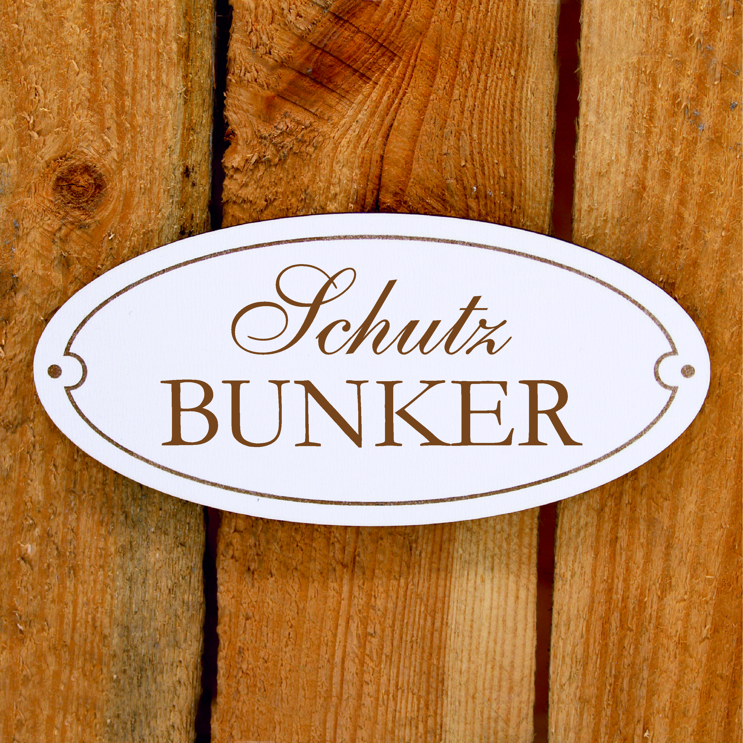 Das SCHUTZ BUNKER Dekosschild besteht aus stabilem, robustem Holzwerkstoff HDF (hochdichte Holzfaserplatte) mit weißer Beschichtung und einer braunen Lasergravur.