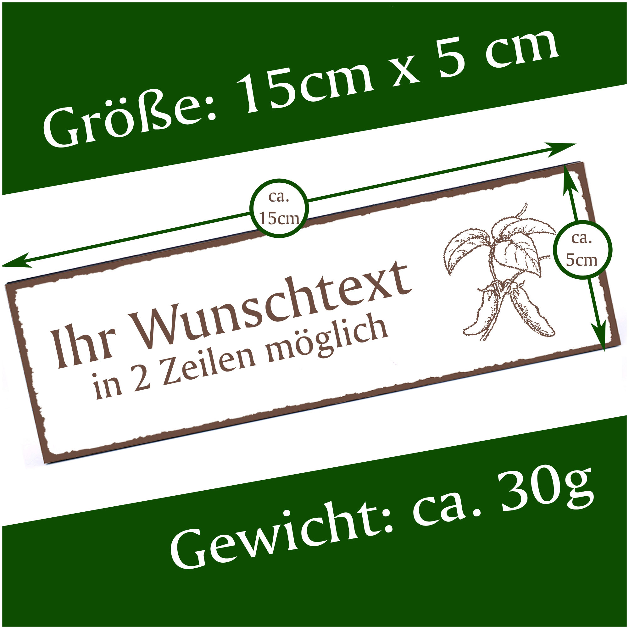 - HOLZSCHILD: Das Türschild ist ca. 150mm x 50mm groß. Das HDF Holz hat eine Stärke von 5mm. Insgesamt wiegt das Schild ca. 30g. Bitte vor Feuchtigkeit schützen