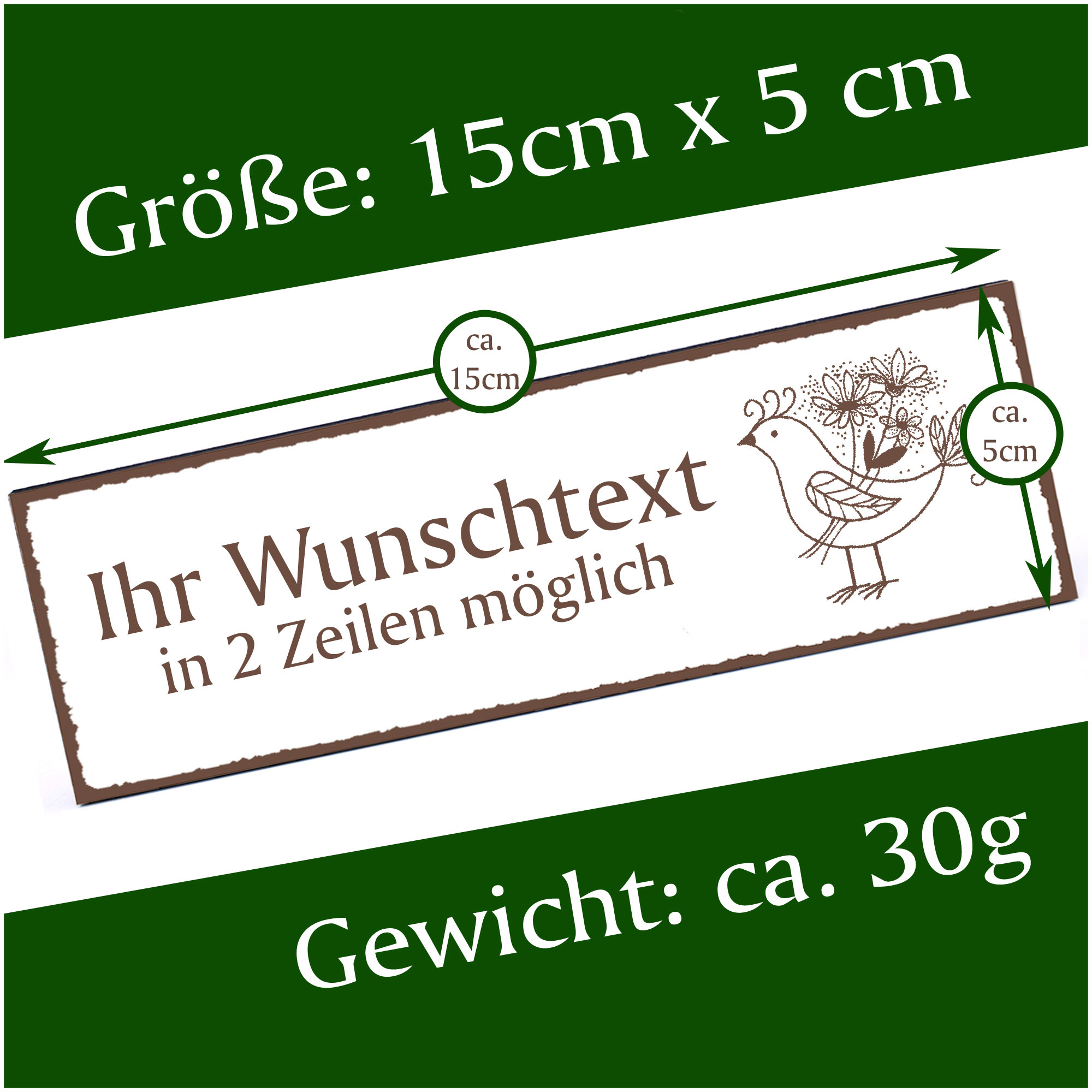 - HOLZSCHILD: Das Türschild ist ca. 150mm x 50mm groß. Das HDF Holz hat eine Stärke von 5mm. Insgesamt wiegt das Schild ca. 30g. Bitte vor Feuchtigkeit schützen