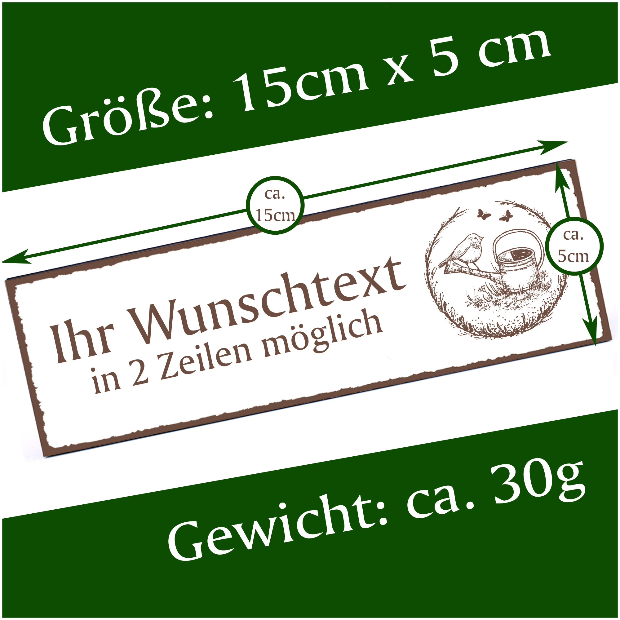 - HOLZSCHILD: Das Türschild ist ca. 150mm x 50mm groß. Das HDF Holz hat eine Stärke von 5mm. Insgesamt wiegt das Schild ca. 30g. Bitte vor Feuchtigkeit schützen