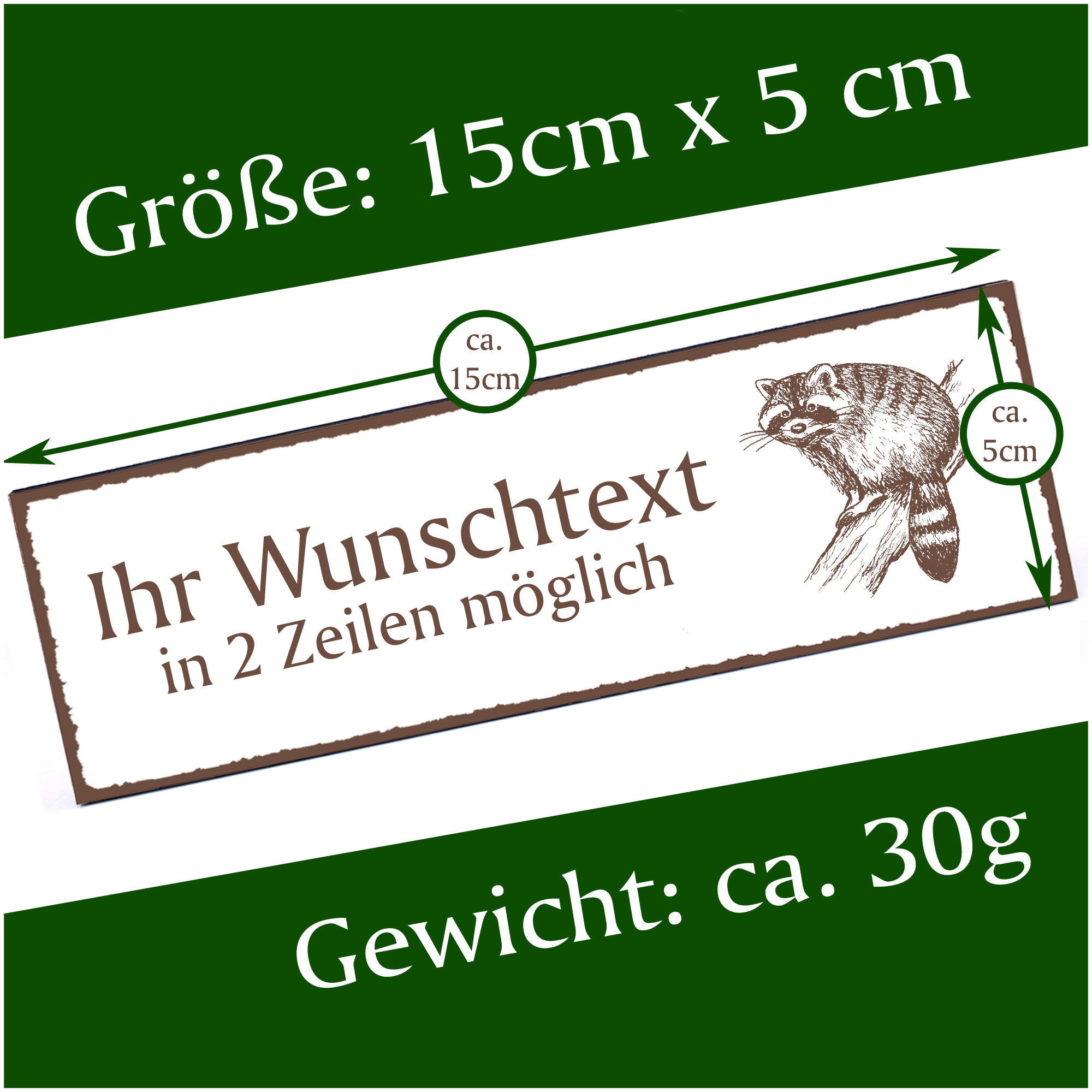 - HOLZSCHILD: Das Türschild ist ca. 150mm x 50mm groß. Das HDF Holz hat eine Stärke von 5mm. Insgesamt wiegt das Schild ca. 30g. Bitte vor Feuchtigkeit schützen