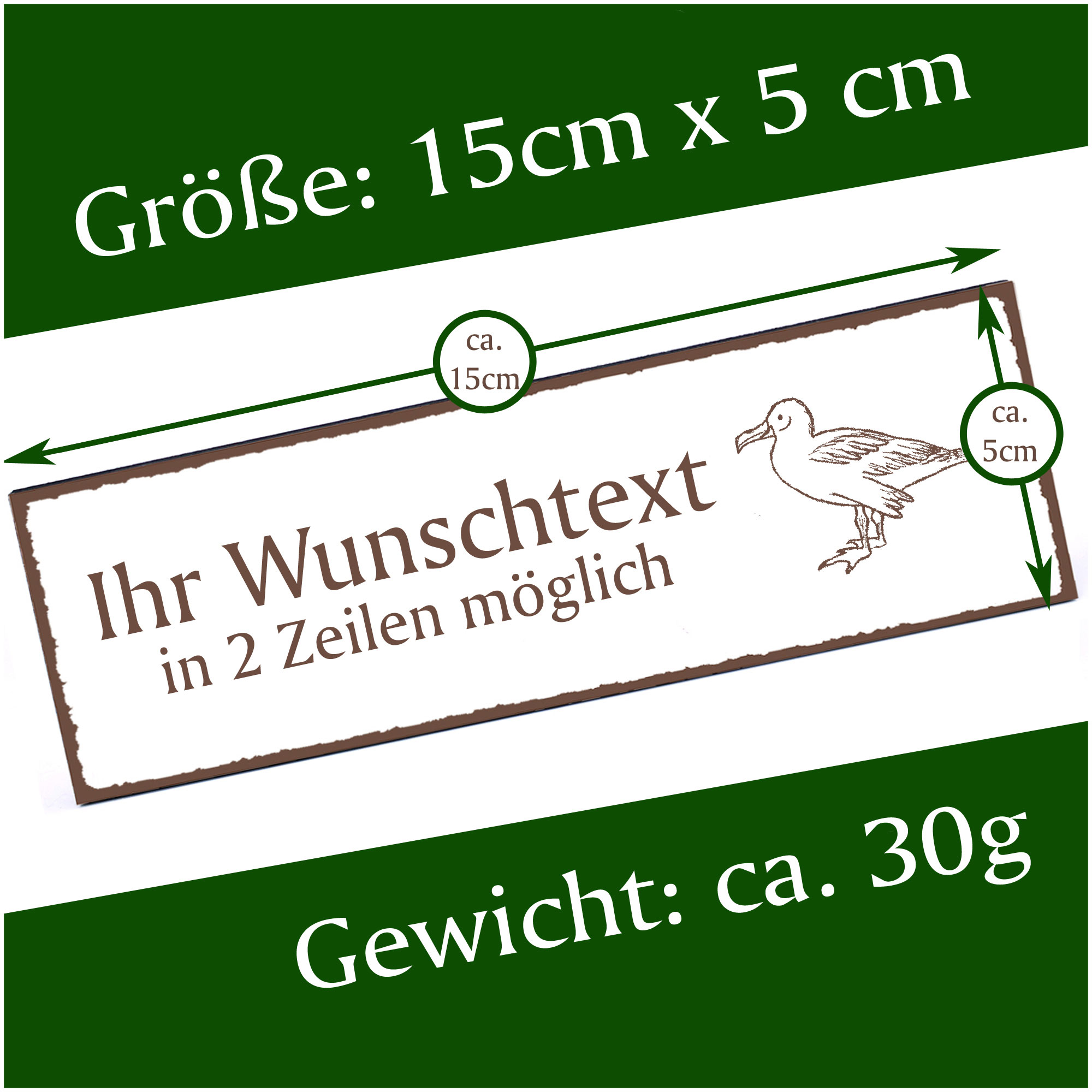 - HOLZSCHILD: Das Türschild ist ca. 150mm x 50mm groß. Das HDF Holz hat eine Stärke von 5mm. Insgesamt wiegt das Schild ca. 30g. Bitte vor Feuchtigkeit schützen