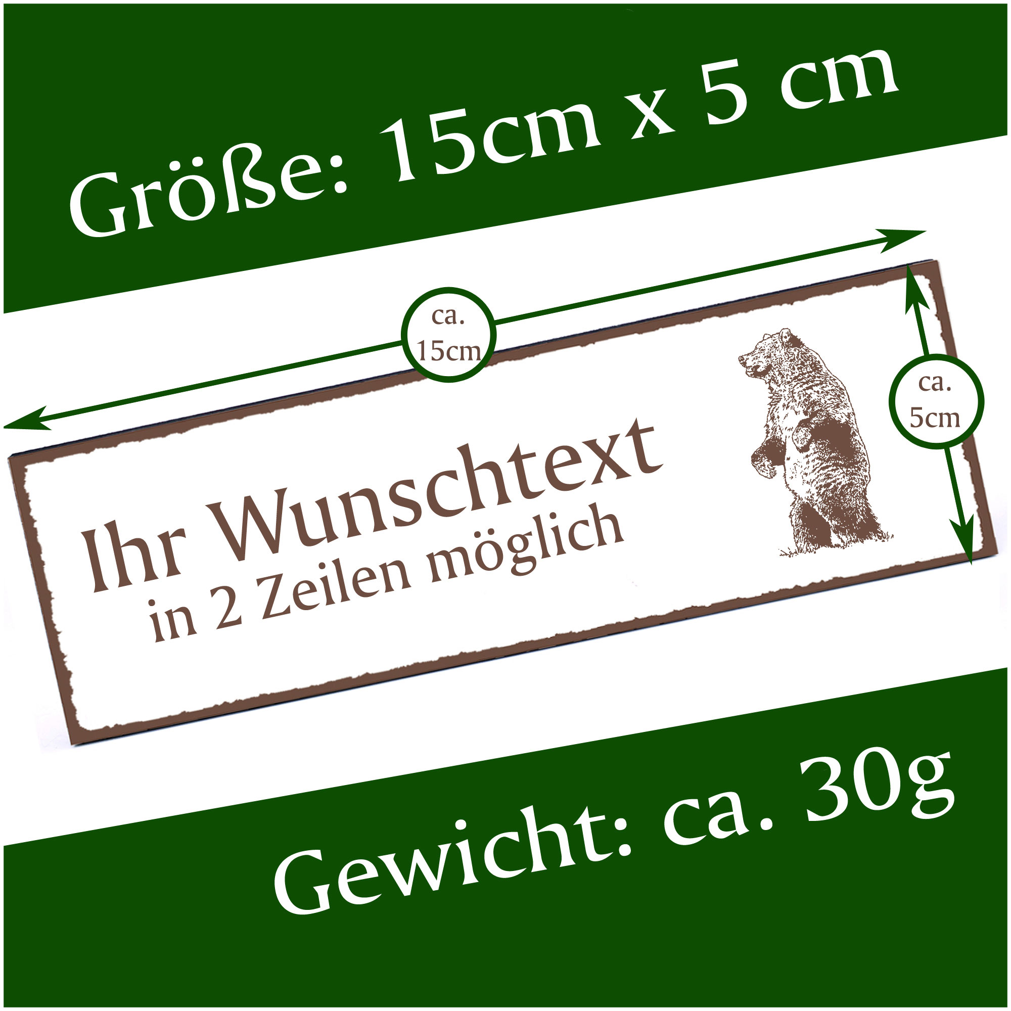 - HOLZSCHILD: Das Türschild ist ca. 150mm x 50mm groß. Das HDF Holz hat eine Stärke von 5mm. Insgesamt wiegt das Schild ca. 30g. Bitte vor Feuchtigkeit schützen