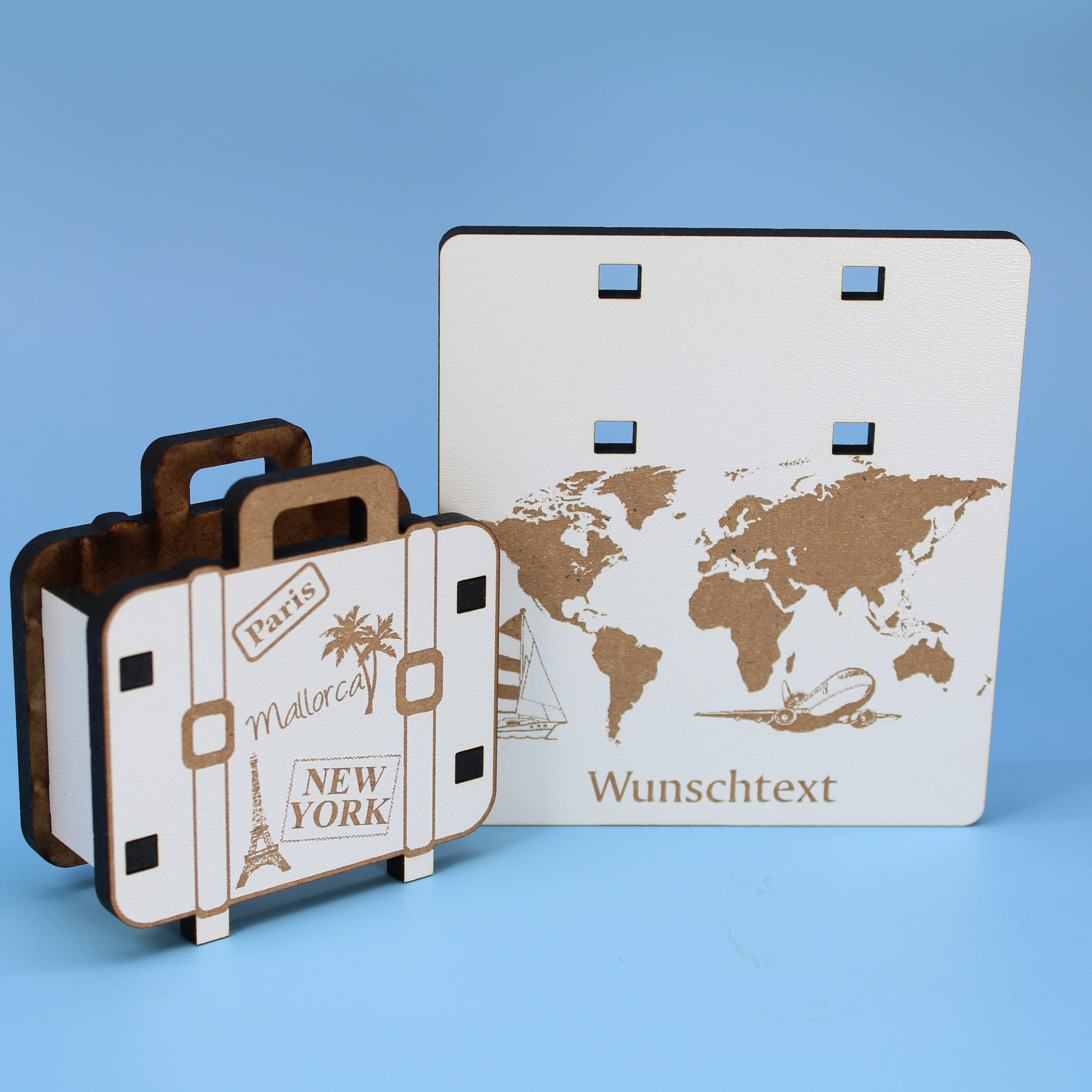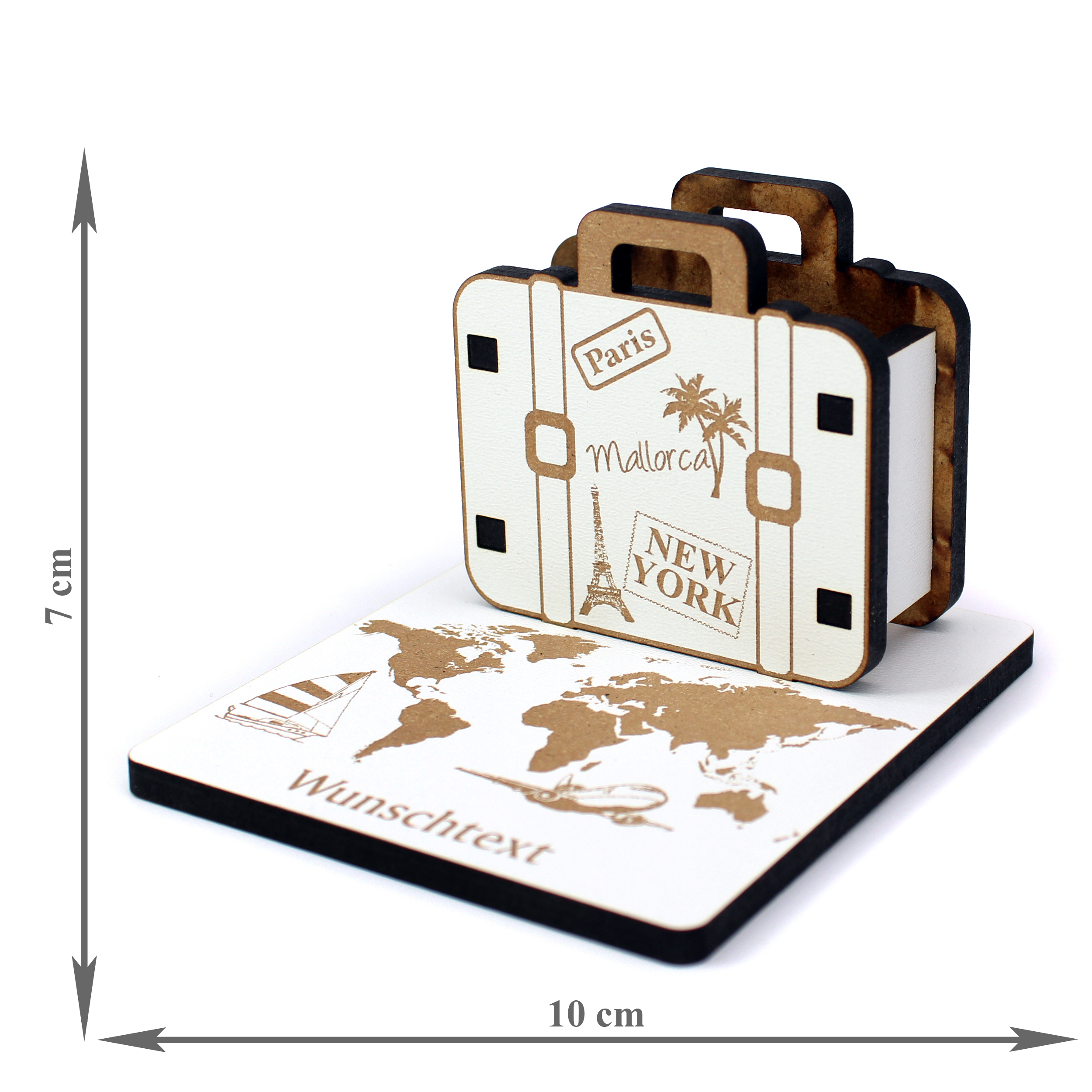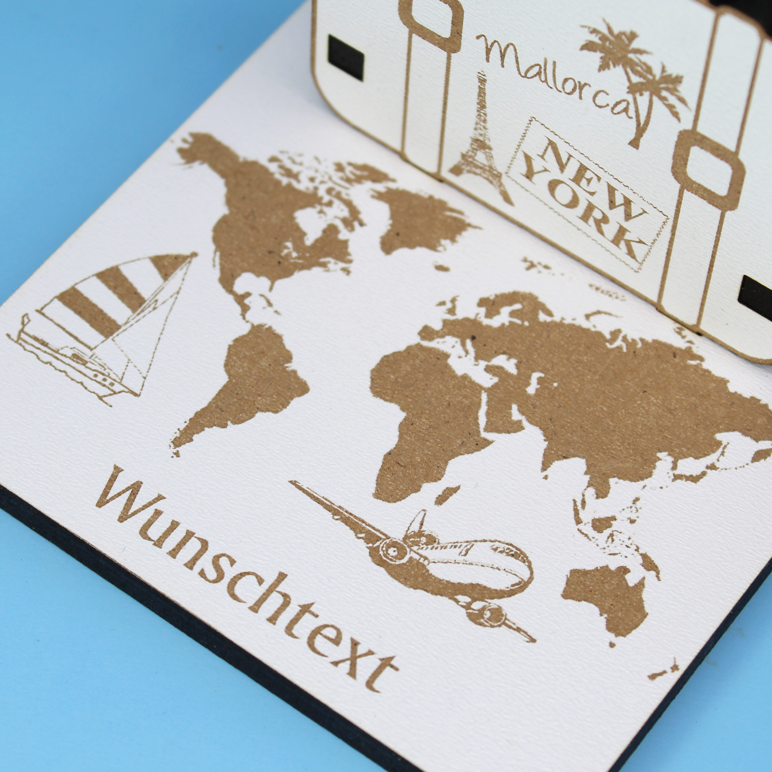 Produktinformationen "Urlaub Geldgeschenk Reisekoffer Weltreise - personalisiert mit Wunschtext - Schild für Geld Gutschein 10 x 7 cm"