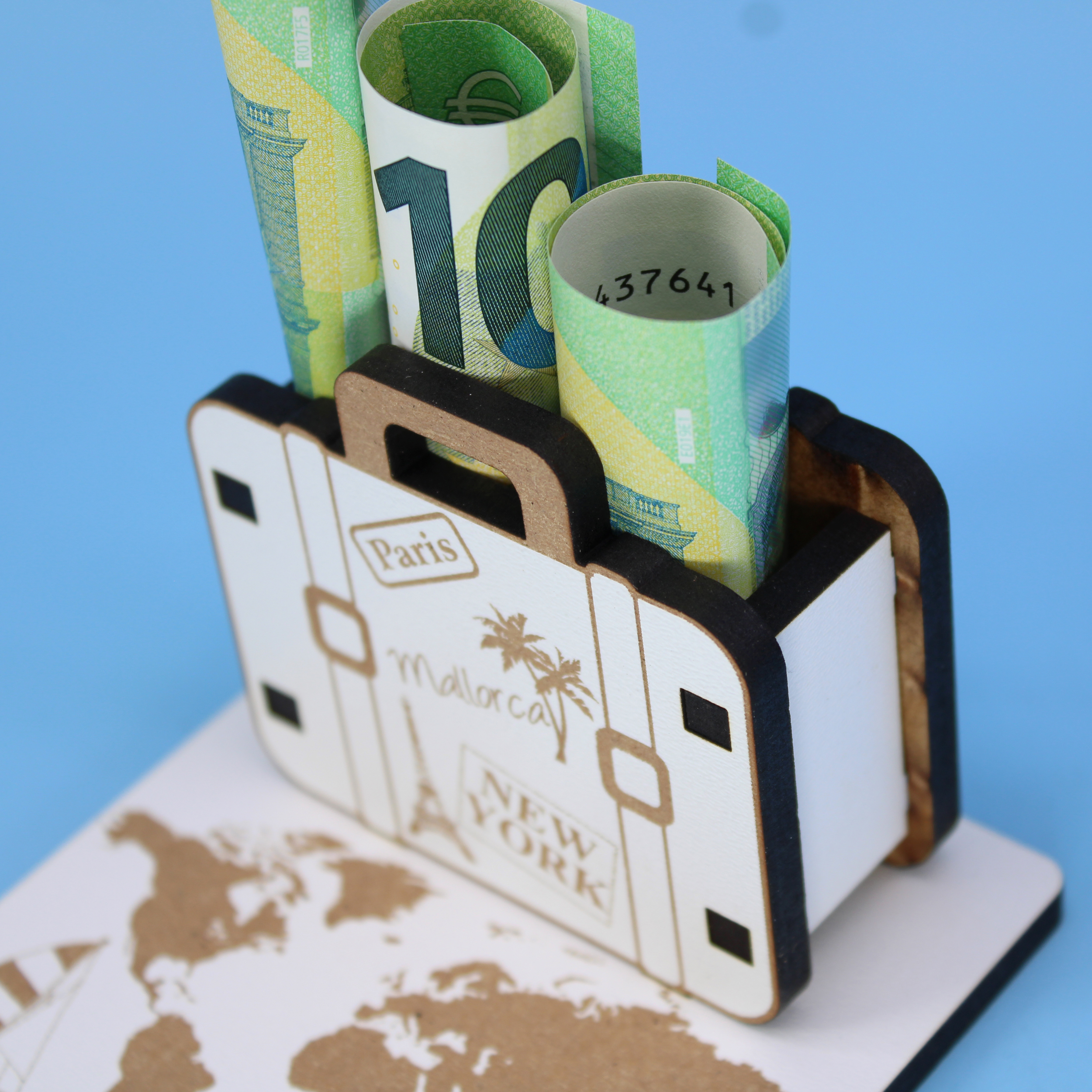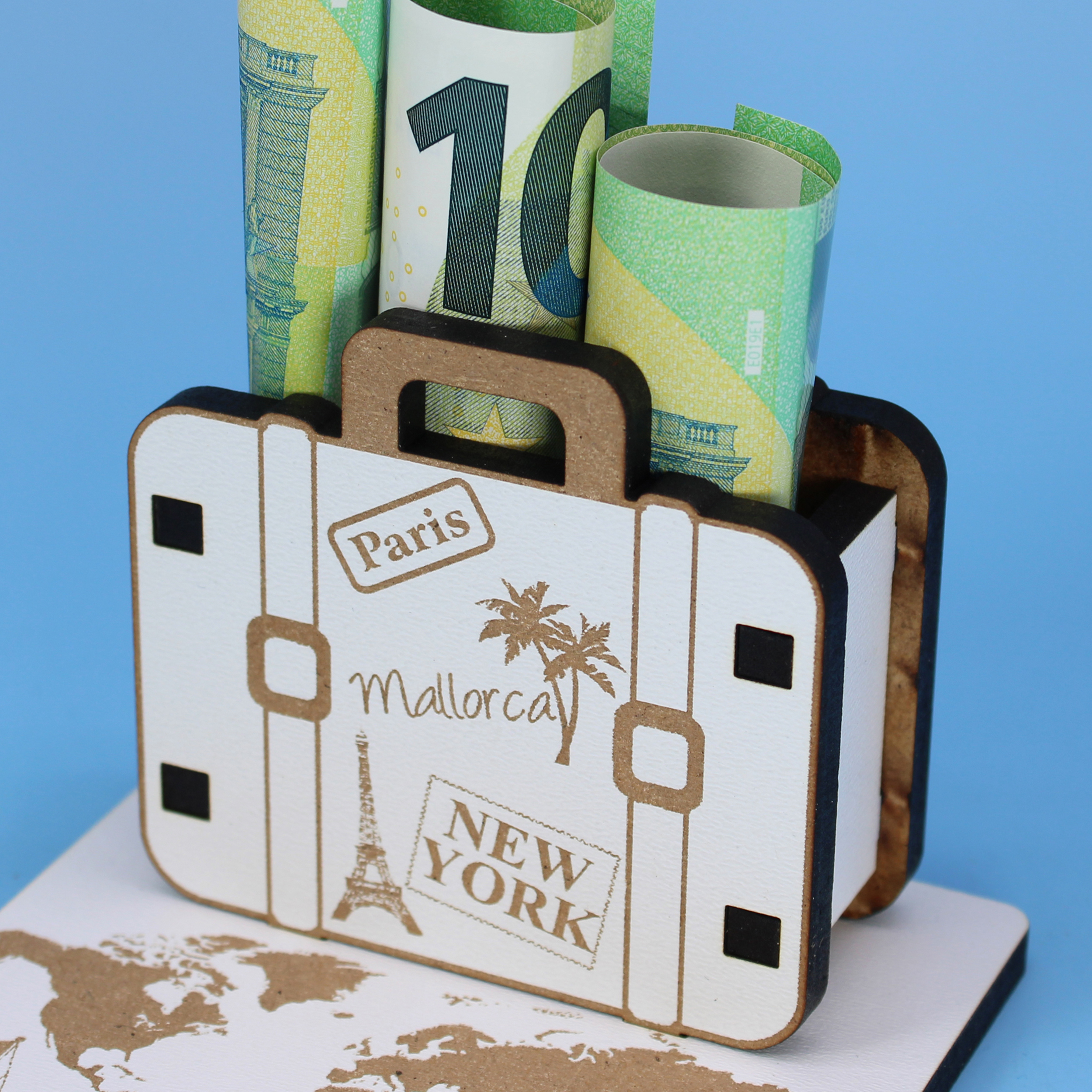 Symbolträchtiges Koffer- & Weltreise-Design: Das Motiv mit Reisekoffer, Weltkarte und Reiseelementen steht für Fernweh, Aufbruch und neue Abenteuer. Ideal als Geldgeschenk oder Gutscheingeschenk für Urlaub, Weltreise, Städtetrip oder Sabbatical.