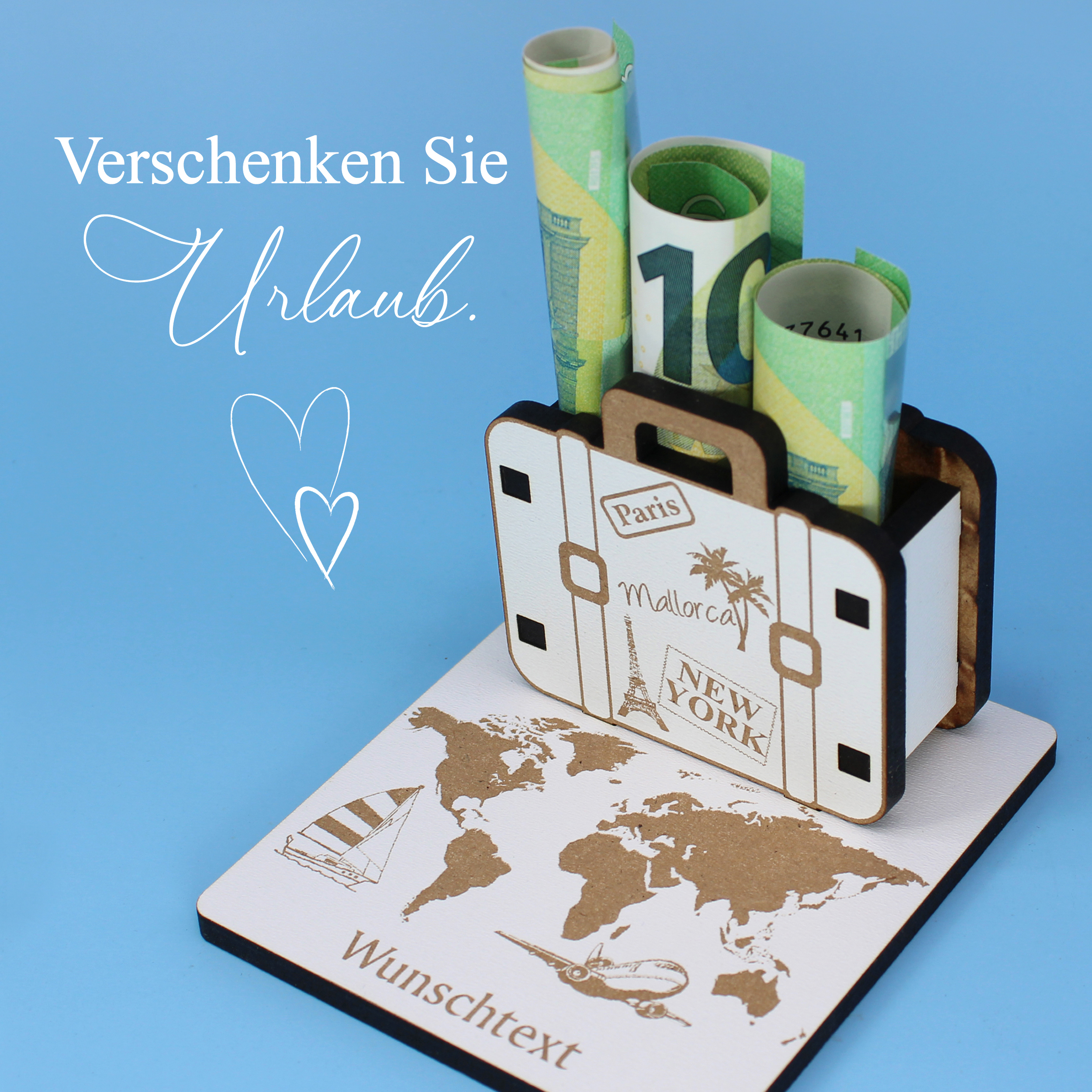 Mit diesem personalisierten Geldgeschenk im Koffer-Design verschenken Sie Geld oder Gutscheine auf besonders kreative und emotionale Weise. Das Reise-Motiv mit Weltkarte und Koffer weckt sofort Fernweh, Vorfreude und Lust auf neue Ziele.