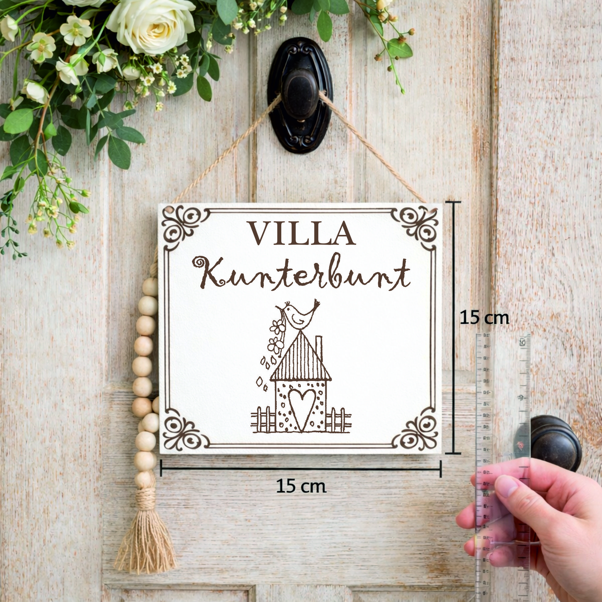 Mit seiner Größe von 15 x 15 cm eignet sich das Dekoschild ideal für Haustür, Flur, Wohnzimmer oder Kinderzimmer.