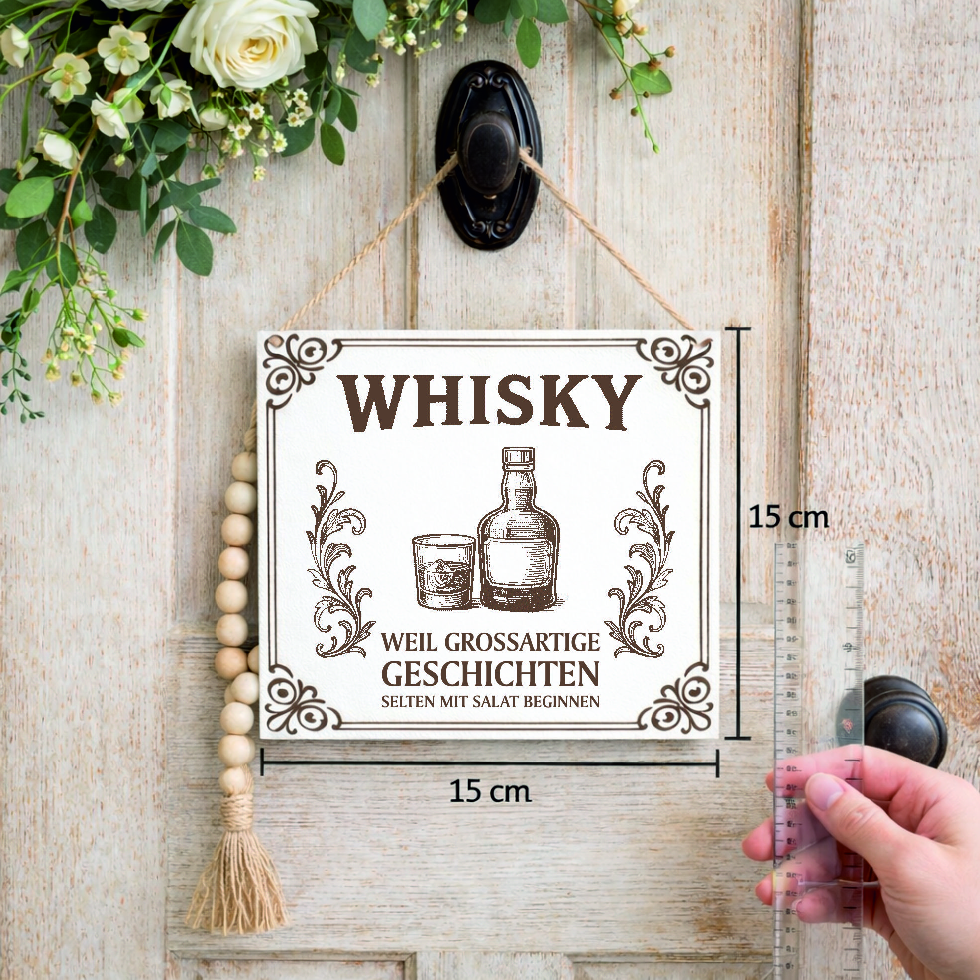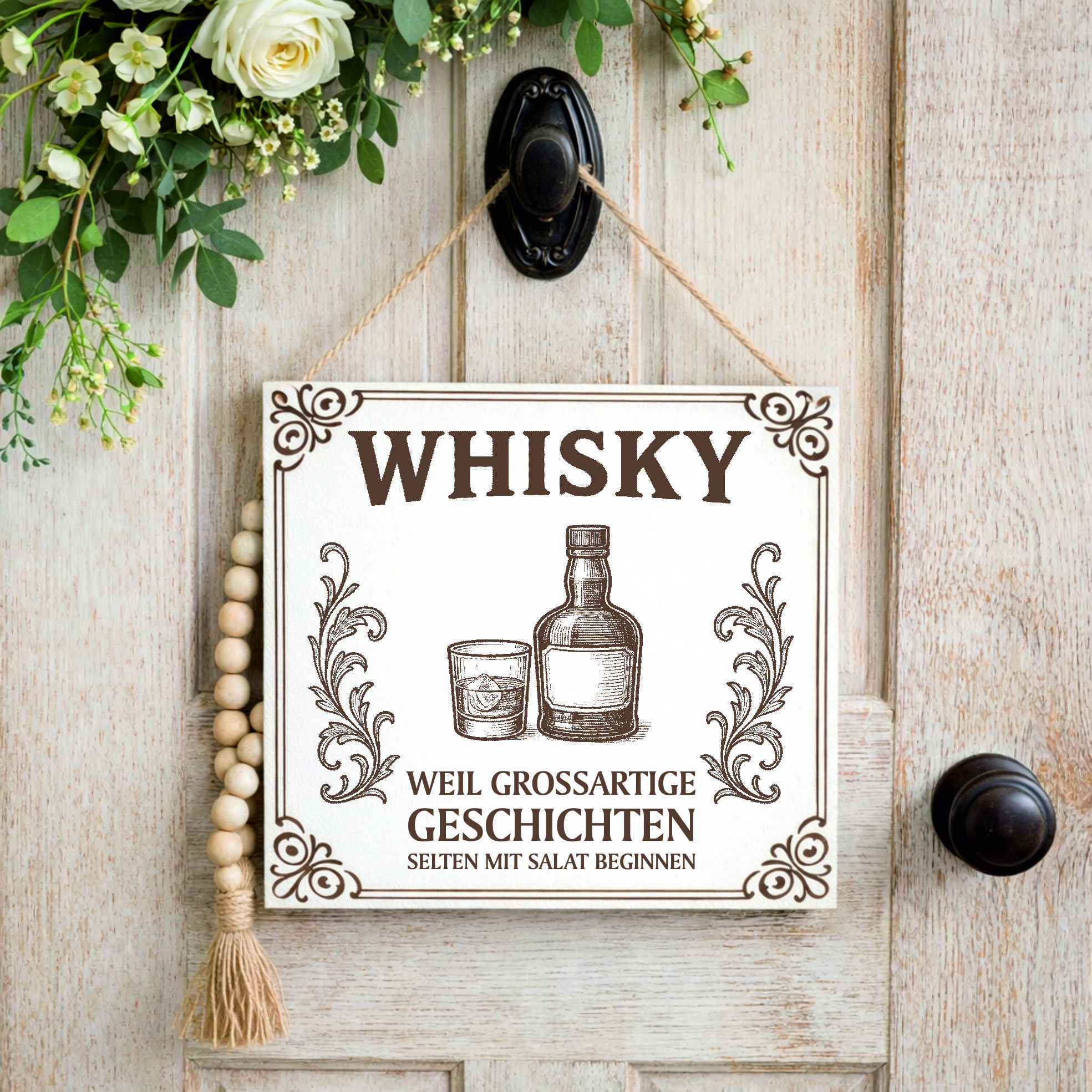 Dekoratives Whisky Schild mit humorvollem Spruch „Weil großartige Geschichten selten mit Salat beginnen“. Hochwertige Lasergravur auf weißem HDF im Vintage-Design – ideal für Bar, Wohnzimmer oder als Geschenk für Whisky Liebhaber.