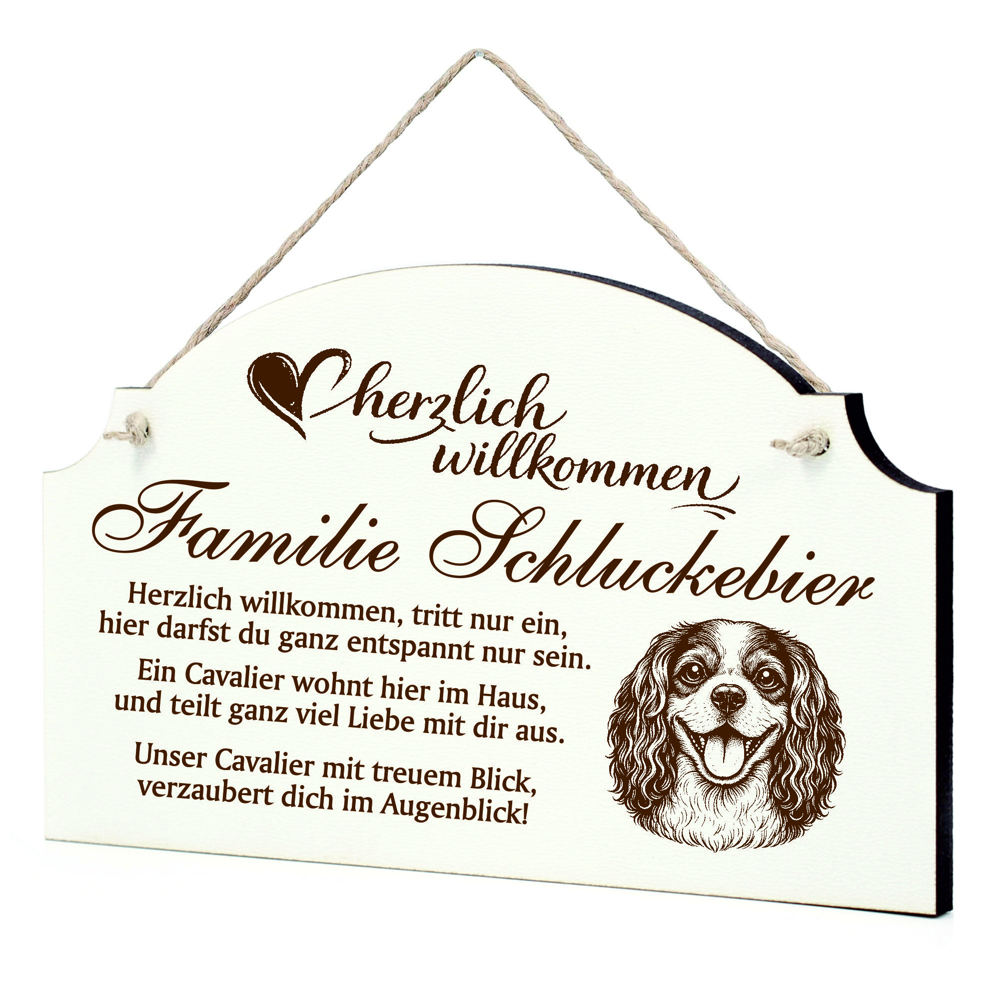 Dieses personalisierte Willkommensschild mit Cavalier King Charles Spaniel Motiv bringt Wärme und Herzlichkeit direkt an Ihre Haustür.