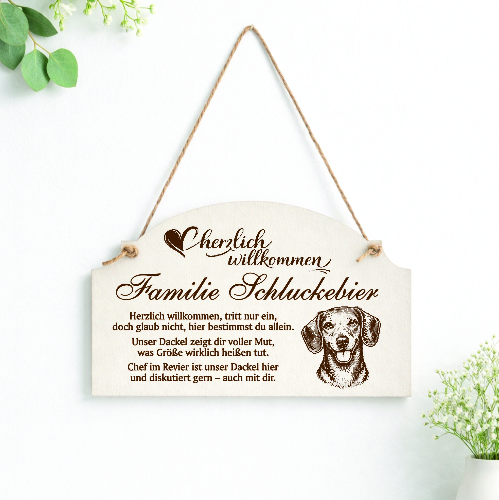 Dieses personalisierte Willkommensschild mit Dackel Motiv bringt Charakter und Humor direkt an Ihre Haustür.