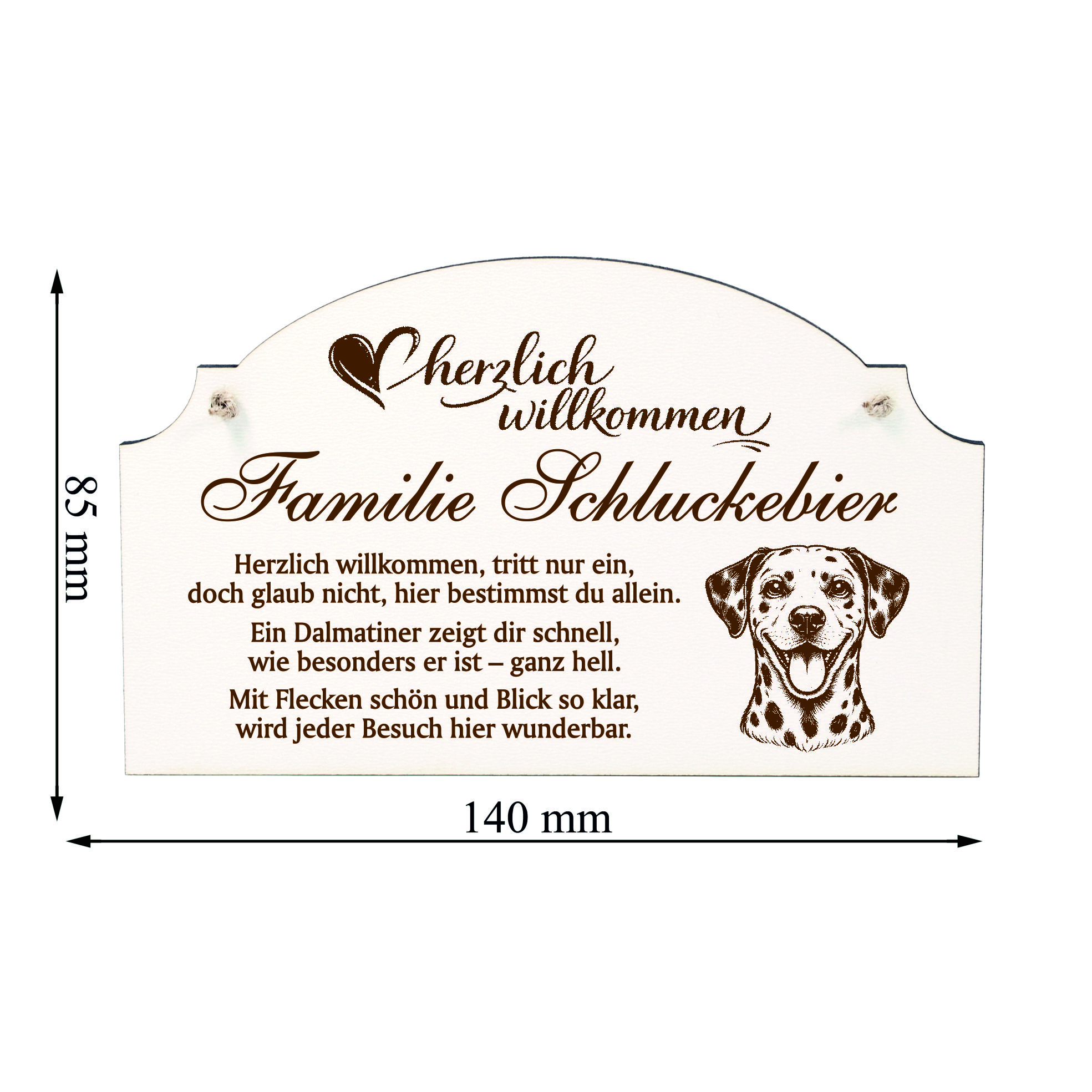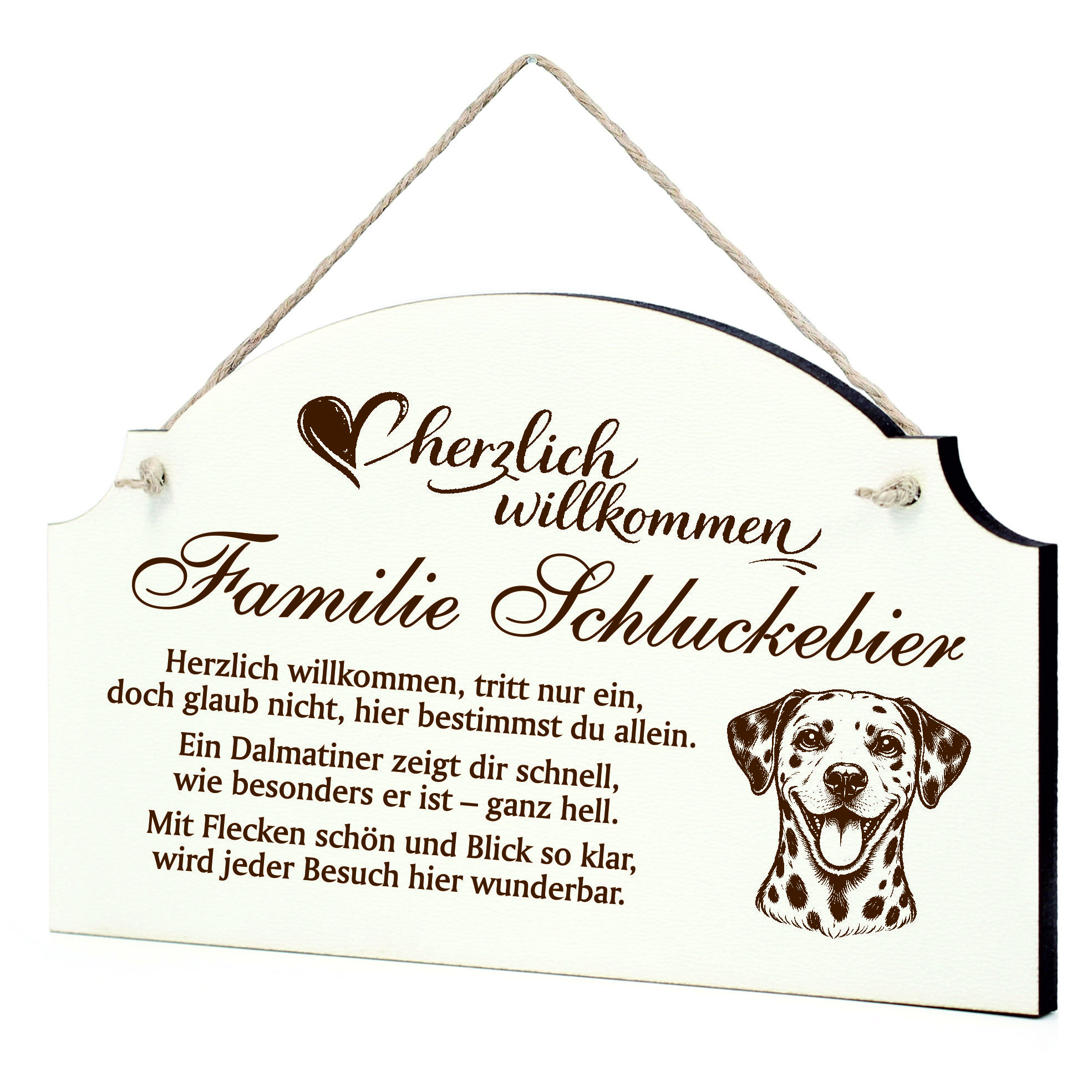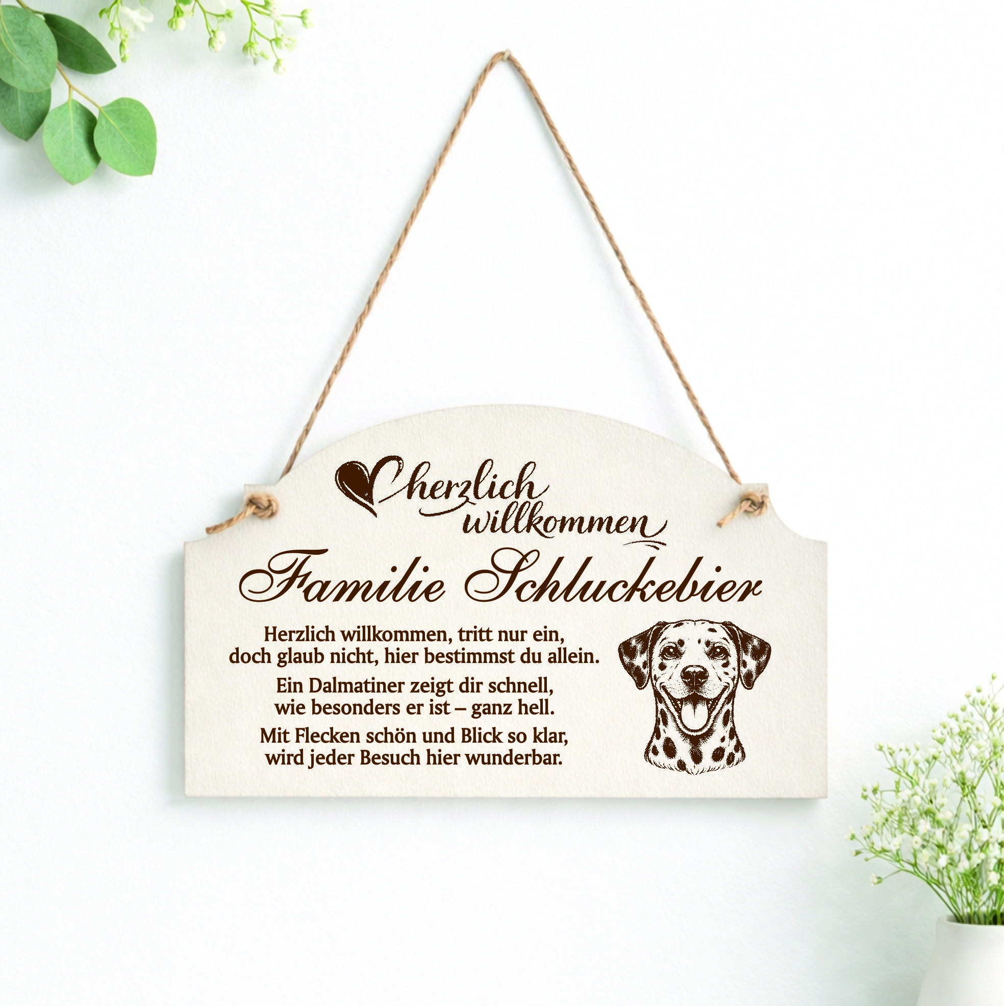 Personalisiert mit Name oder Familienname: Das Türschild wird individuell mit Ihrem Wunschnamen oder Familiennamen gestaltet und erhält dadurch eine persönliche Note. So entsteht ein dekoratives Hundeschild, das perfekt zu Ihrem Zuhause und zu Ihrem Dalmatiner passt.