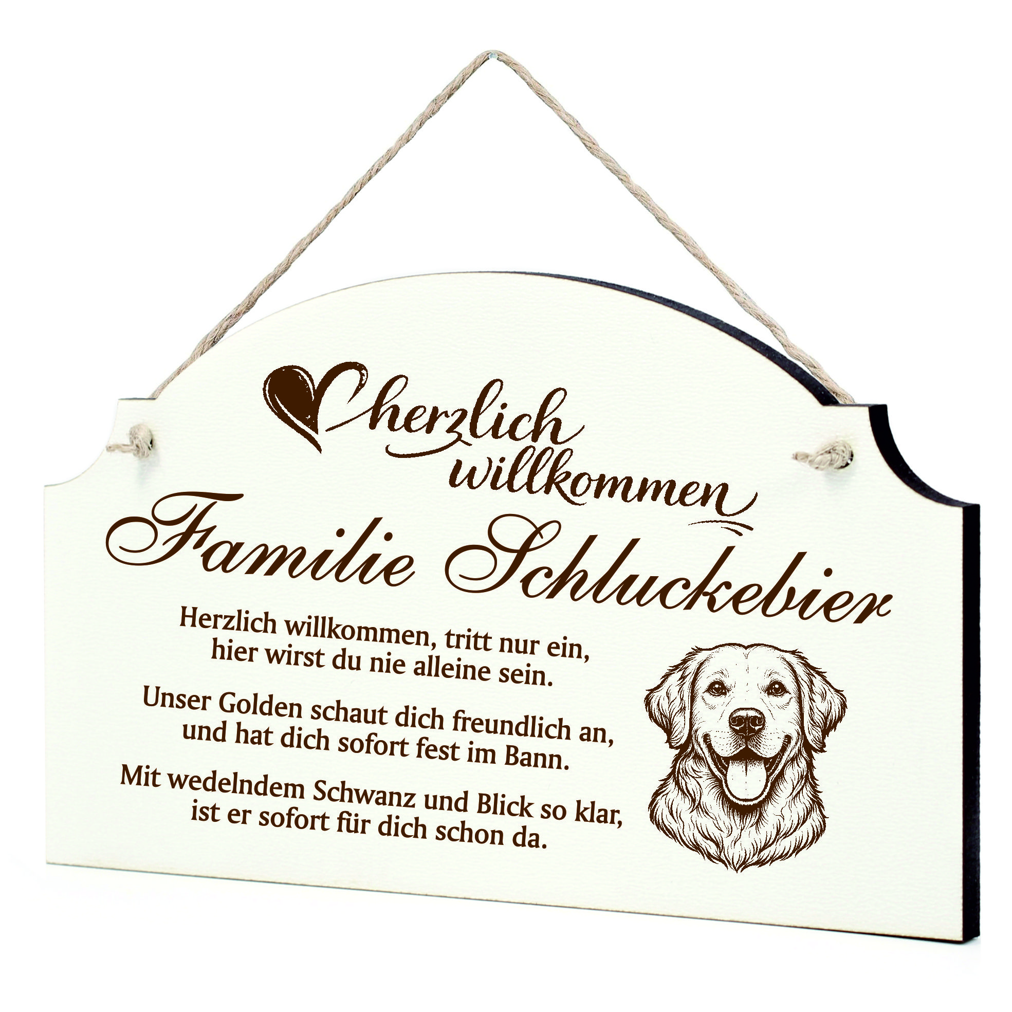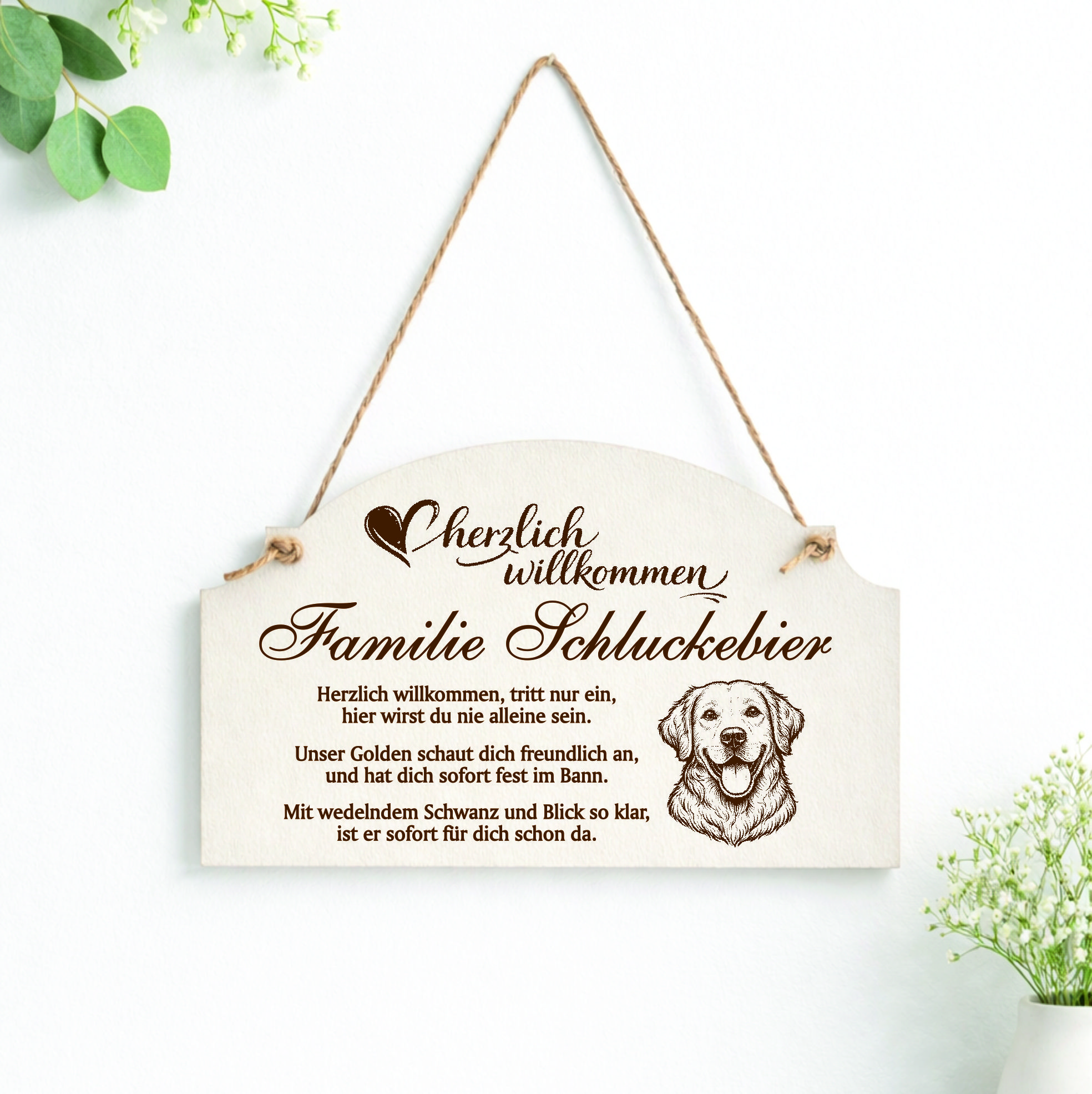 Dieses personalisierte Willkommensschild mit Golden Retriever Motiv bringt Wärme, Freundlichkeit und Persönlichkeit in Ihren Eingangsbereich.