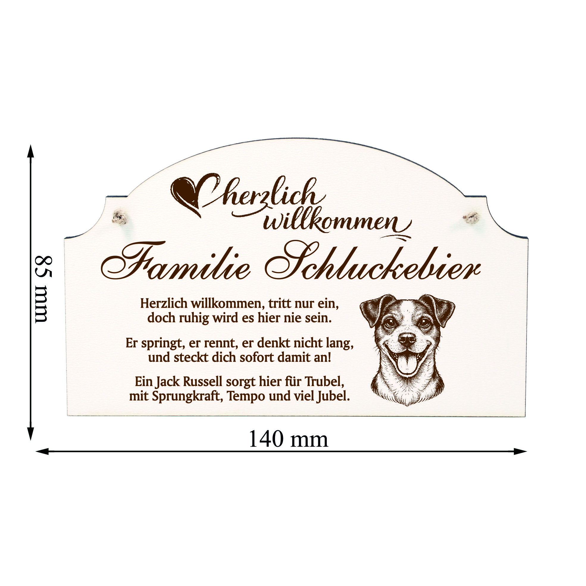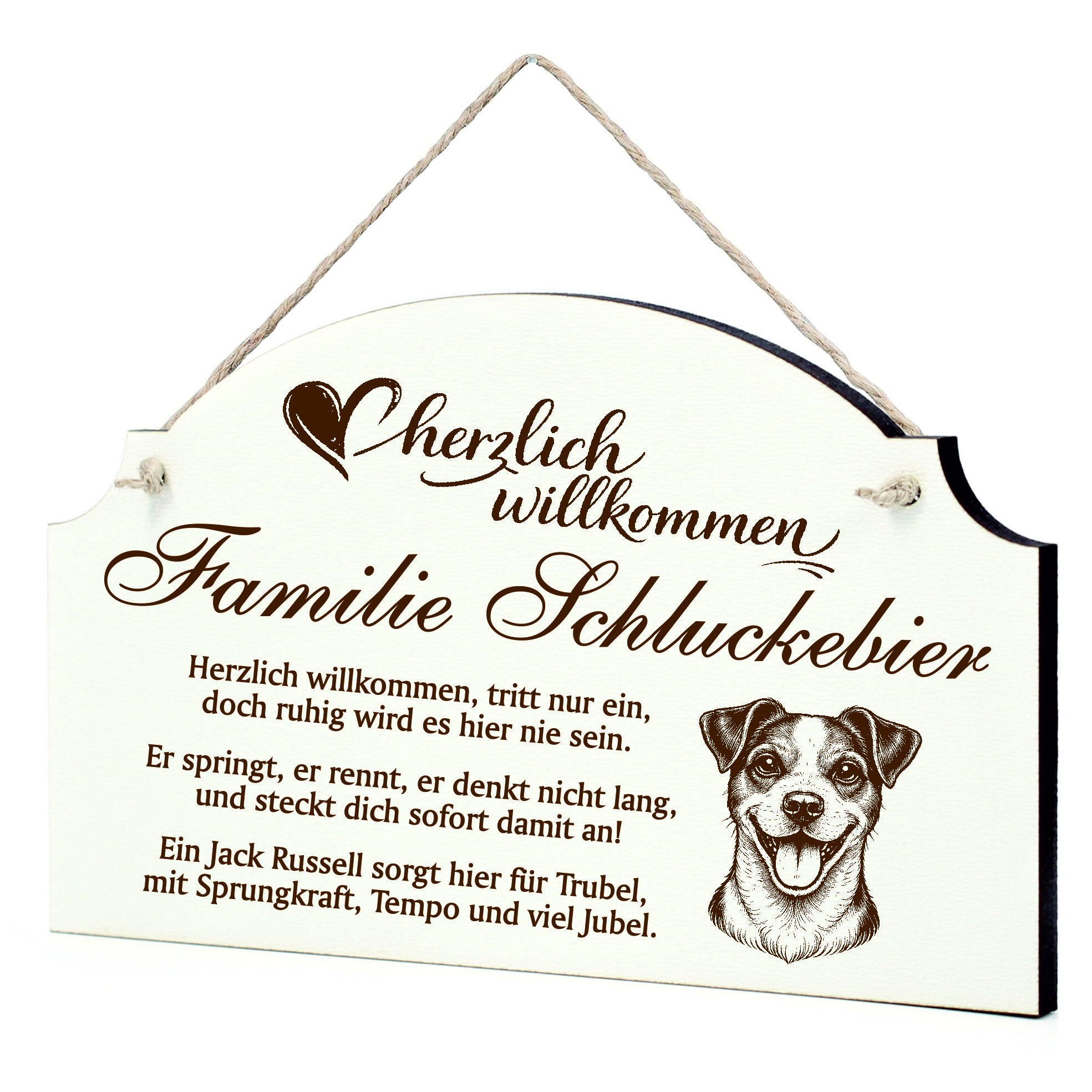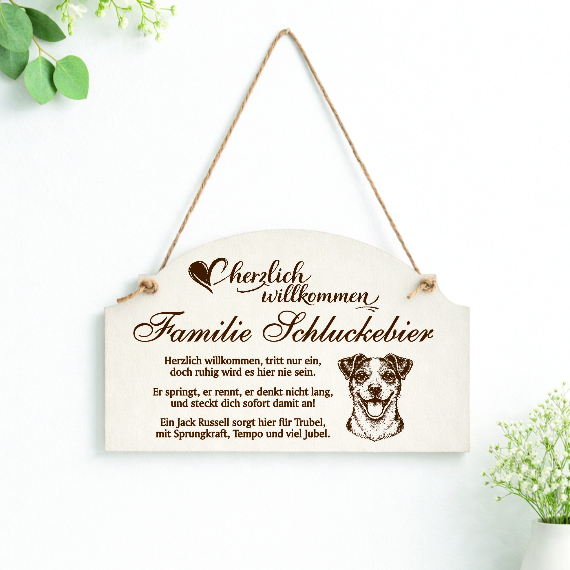 Personalisiert mit Name oder Familienname: Das Schild wird individuell mit Ihrem Wunschnamen oder Familiennamen gestaltet und verleiht Ihrem Eingangsbereich eine persönliche Note. So entsteht ein dekoratives Türschild, das perfekt zu Ihrem Zuhause und Ihrem Jack Russell Terrier passt.