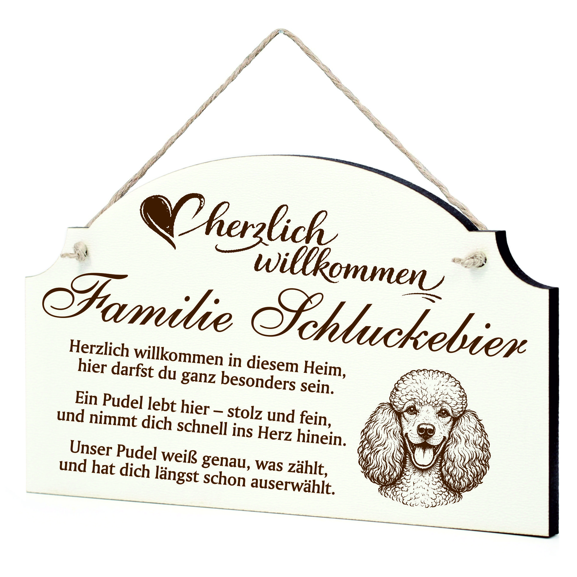 Personalisiert mit Name oder Familienname: Das Schild wird individuell mit Ihrem Wunschnamen oder Familiennamen gestaltet und verleiht Ihrem Zuhause eine persönliche und elegante Note. So entsteht ein dekoratives Türschild, das perfekt zu Ihrer Familie und Ihrem Pudel passt.