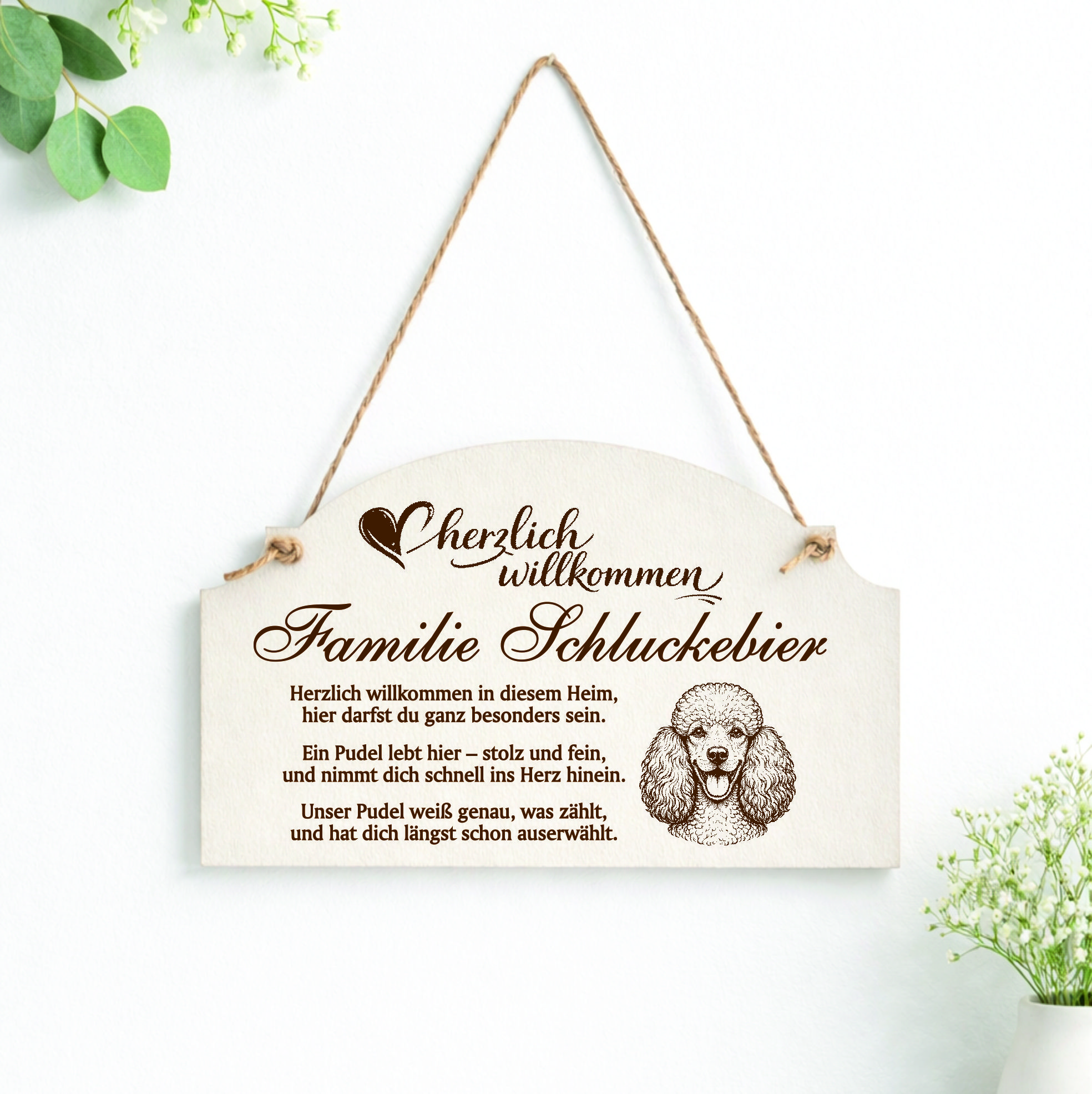 Dieses personalisierte Willkommensschild mit Pudel Motiv bringt Stil, Herzlichkeit und Hundefreude direkt an Ihre Haustür.