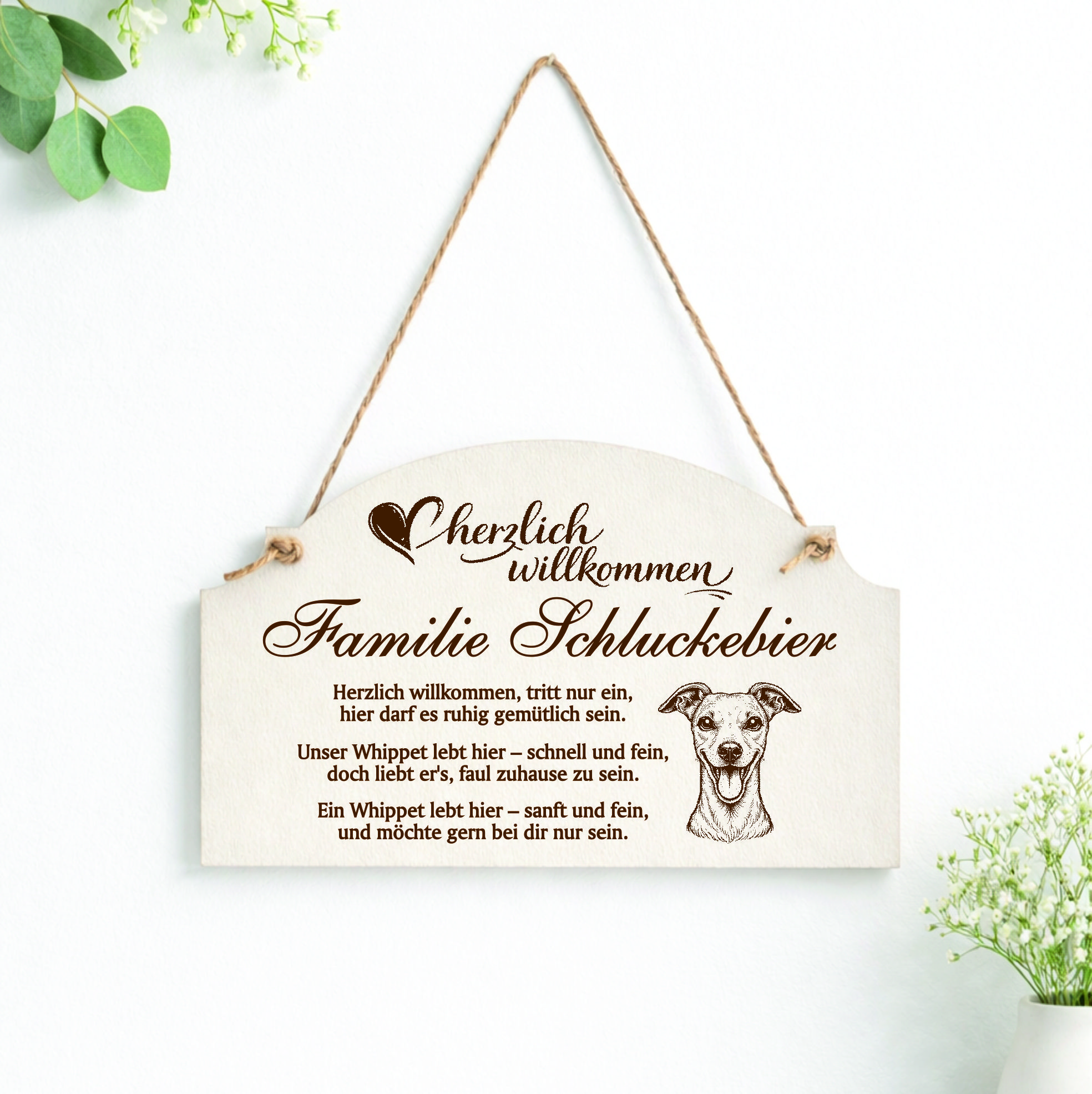 Dieses personalisierte Willkommensschild mit Whippet Motiv bringt Stil, Ruhe und Hundefreude direkt an Ihre Haustür.