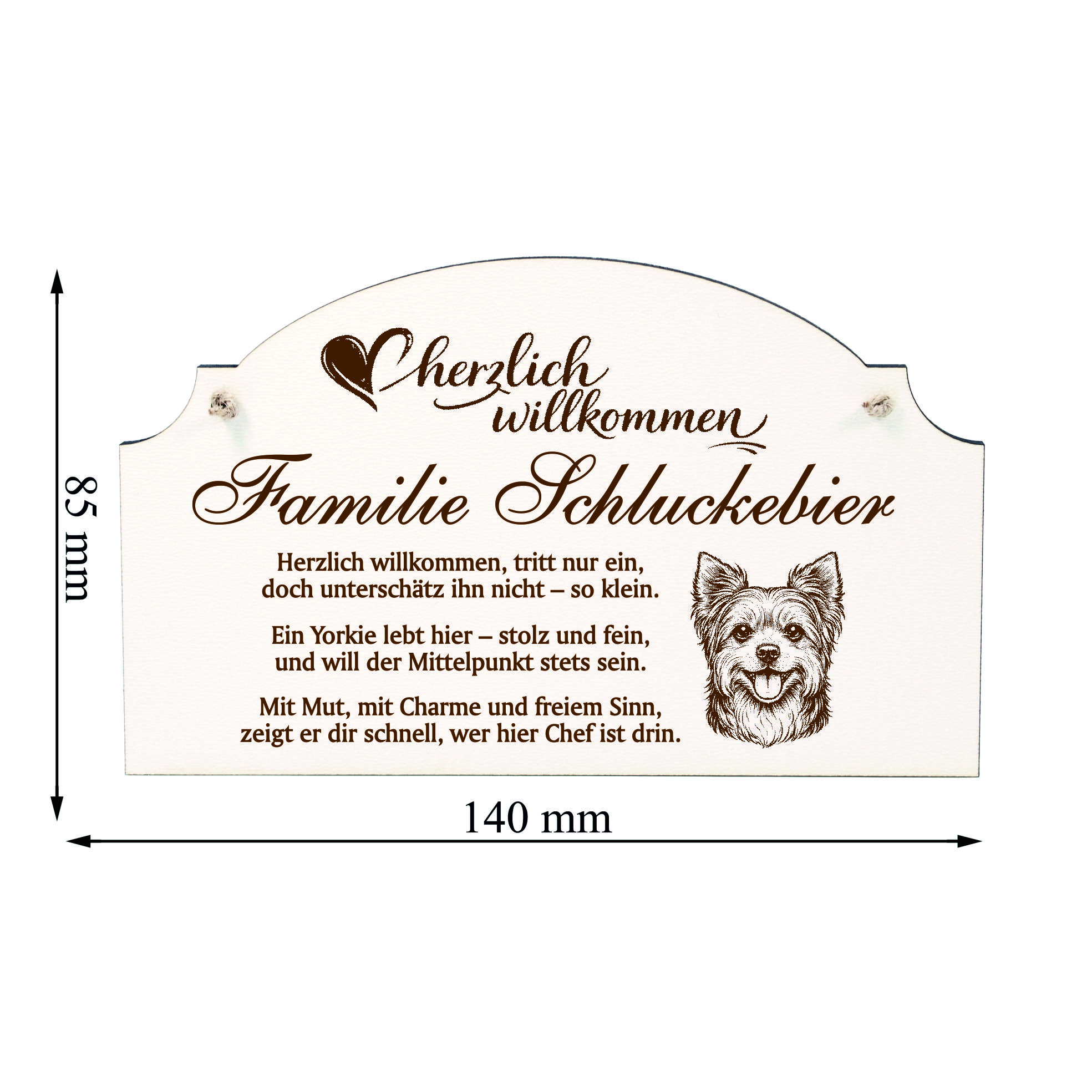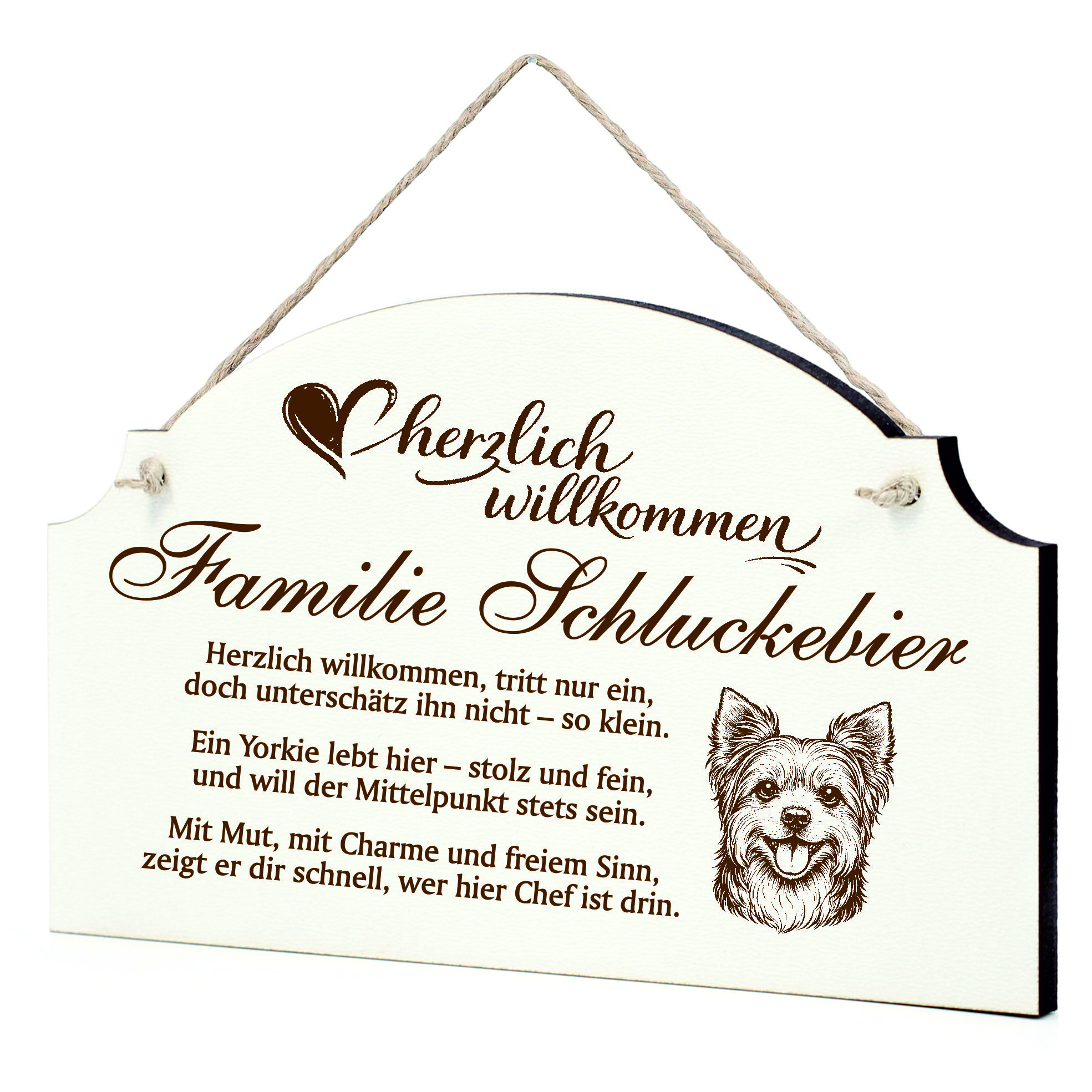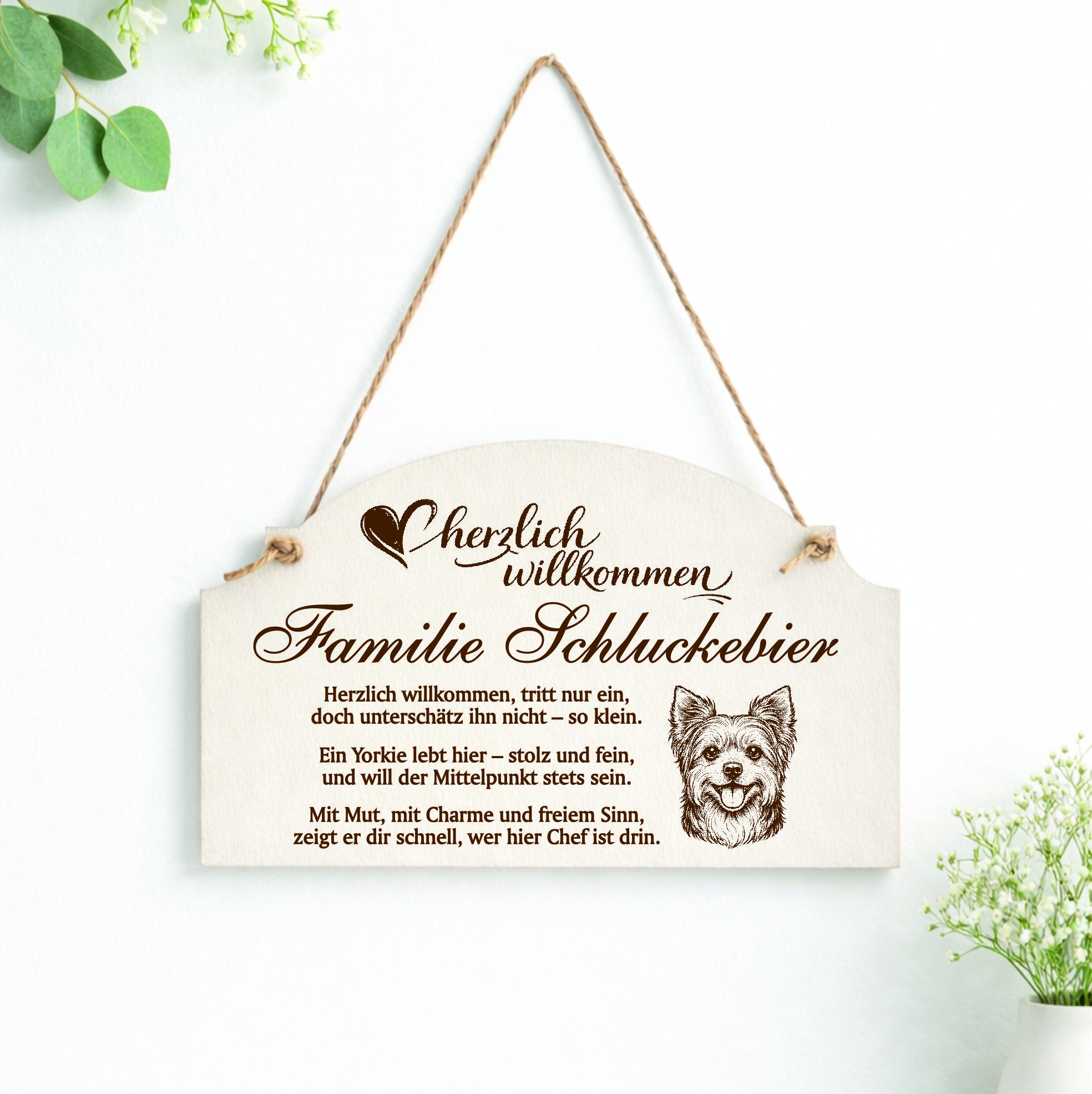 Personalisiert mit Name oder Familienname: Das Schild wird individuell mit Ihrem Wunschnamen oder Familiennamen gestaltet und verleiht Ihrem Zuhause eine persönliche und stilvolle Note. So entsteht ein Türschild, das perfekt zu Ihrer Familie und Ihrem Yorkshire Terrier passt.