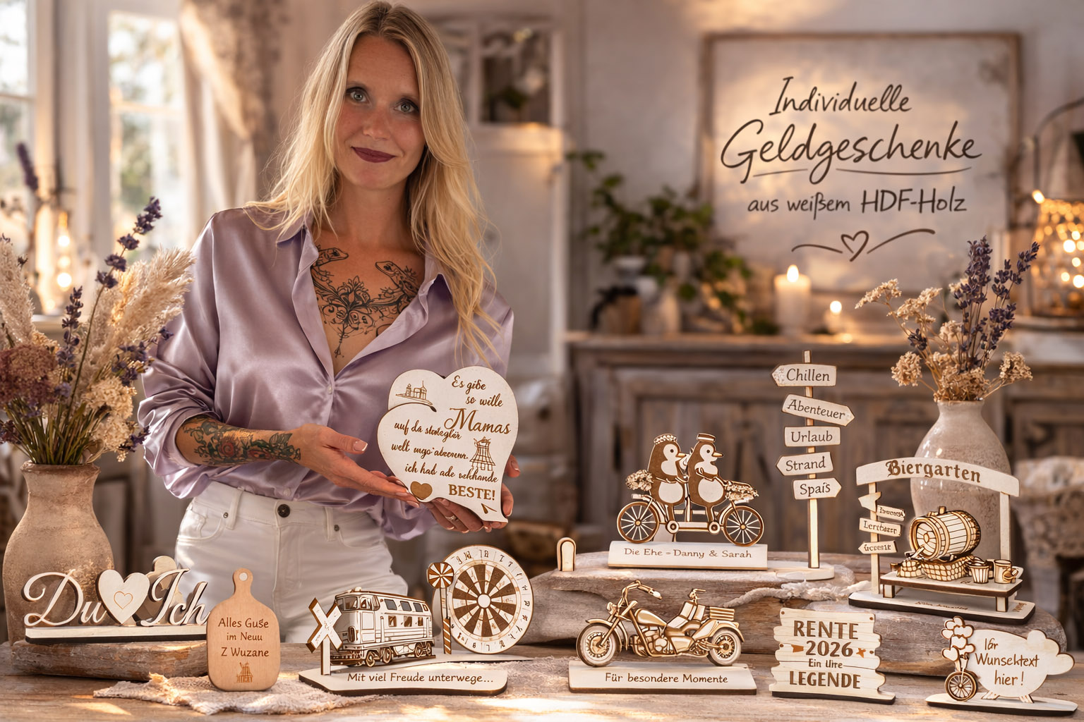 Unsere liebevoll gestalteten Deko-Aufsteller aus weißem HDF-Holz sind eine besondere und kreative Möglichkeit, Geldgeschenke stilvoll zu überreichen. Mit viel Liebe zum Detail gefertigt, verbinden sie modernes Design mit einer warmen, natürlichen Ausstrahlung und passen perfekt in ein gemütliches Wohnambiente im Landhausstil. Die filigranen Motive – ob Motorrad, Fahrrad, Biergarten, Gitarre, Dart oder individuelle Wunschmotive – werden präzise ausgearbeitet und auf stabilen Standfüßen präsentiert.