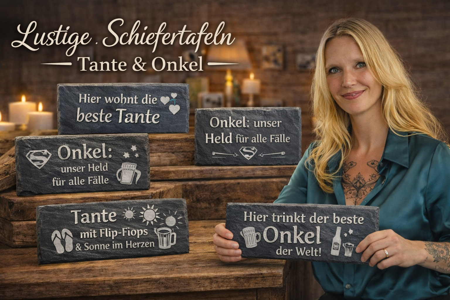 Die schmale Form der Schiefertafeln eignet sich perfekt für kurze Botschaften wie „Lieblings-Tante“, „Bester Onkel der Welt“, „Hier wohnt die beste Tante“ oder „Onkels Lieblingsplatz“. Solche Tafeln bringen Persönlichkeit und eine persönliche Note in den Eingangsbereich, an Türen, in den Garten oder an besondere Lieblingsplätze im Haus. Gleichzeitig sorgen sie für ein dekoratives Detail mit einem Augenzwinkern.