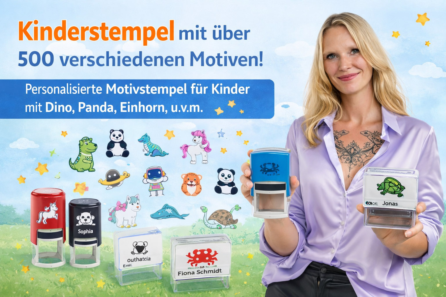 Von niedlichen Tieren wie Panda, Dino oder Schildkröte über Einhorn, Fahrzeuge und viele weitere kindgerechte Designs: Jedes Motiv kann mit dem gewünschten Namen personalisiert werden. So entsteht ein einzigartiger Namensstempel, der nicht nur praktisch ist, sondern auch Kinderaugen zum Leuchten bringt.